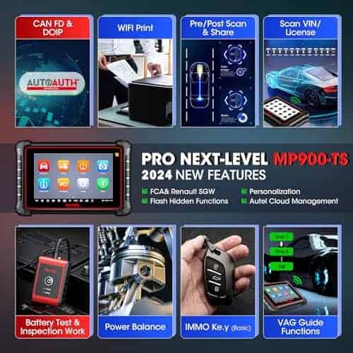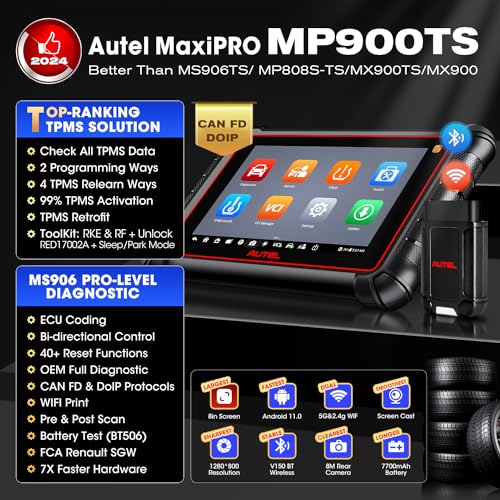 2024 AUTEL MP900TS, MISMO QUE MS906 PRO-TS En funcionalidad: MP900-TS MS906 PRO-TS MS906TS MP808S-TS MK808S-TS MX900TS, mejor que MS906 PRO MP900-BT KIT MP900E MS906BT con Pro TPMS y mayor cobertura de vehículos. Admite: Programación TPMS& Reinicio& Activación PRO-ECU Codificación en línea 40+ Servicios 3K+ Pruebas Activas Control Bidireccional OE Inalámbrico 33 pies Diagnóstico completo 99% Base de Datos de Autos Personalización de 99. VAG Guide.2024 Nuevas funciones: CAN-FD&DOIP Protocolo VIN& Escaneo de licencia Impresión WIFI Pre&Post Scan. Android 11.0 con 8 pulgadas Pantalla más grande, más suave que MK908 MS906 MP808.