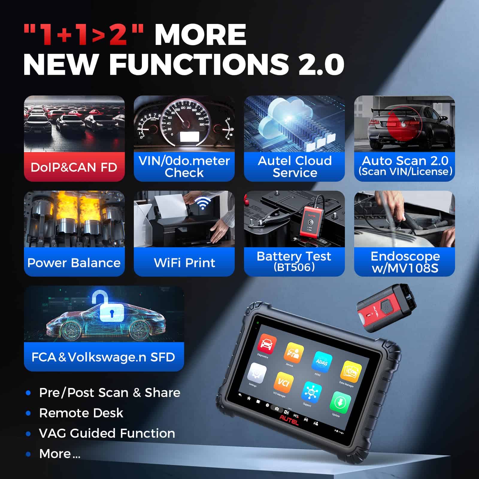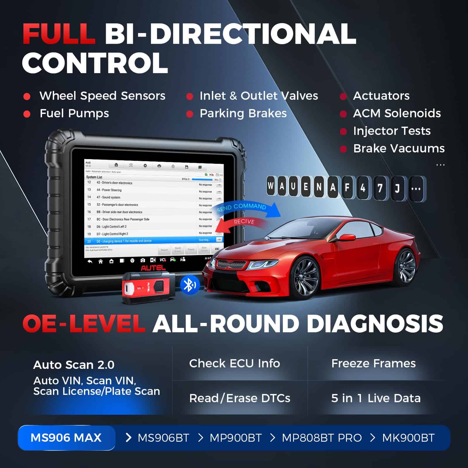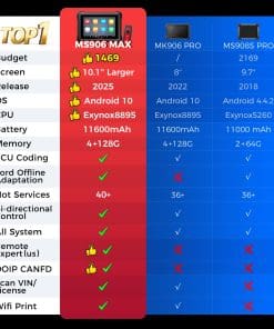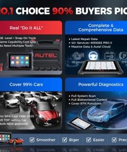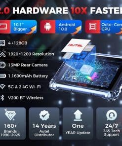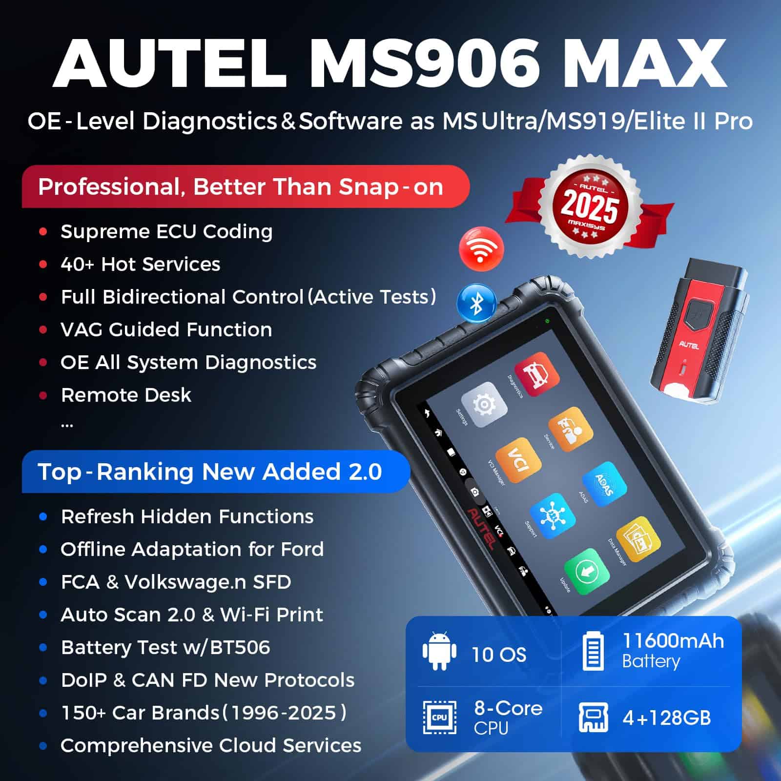 El Autel MaxiSys MS906 MAX es un escáner automotriz avanzado que destaca por su pantalla grande de 10.1″ y funciones potentes, ideal para usuarios profesionales y cómodos. Con cobertura de más de 160 marcas de automóviles y 15000+ modelos, ofrece funciones de nivel OE como Codificación ECU Avanzada, Control Bi-direccional Completo, 40+ Servicios, Escaneo de Todos los Sistemas, Escaneo Automático 2.0, Soporte DOIP CANFD, Guía VAG, Prueba de Batería, Impresión WiFi, Nube Autel, etc. Además, cuenta con Codificación ECU de Nivel OE, 40+ Servicios Esenciales, Control Bi-direccional Completo, Soporte MASIVO ADAS, Cobertura de más de 15,000 modelos de 1996 a más recientes, y funciones adicionales de alta gama como Escaneo Automático en segundos, AutoAuth FCA SGW Bypass, Emparejamiento de Componentes, Funciones Guiadas VAG, Servicio Remoto de Expertos (Requiere su N/S), Balance de Potencia, Autel Cloud, Inicio de Sesión de Cuenta en Línea, Escaneo de VIN/Licencia, Impresión WiFi, Pruebas de Batería con BT506, Endoscopio con Autel MV108S/MV105S, entre otros. Conecta de forma inalámbrica mediante Bluetooth para comunicación con los sistemas de control del vehículo. Además, cuenta con diseño duradero con batería de 11600 mAh para uso durante todo el día, CPU de 8 núcleos y espacio de almacenamiento de 128 GB para una operación fluida sin retrasos.