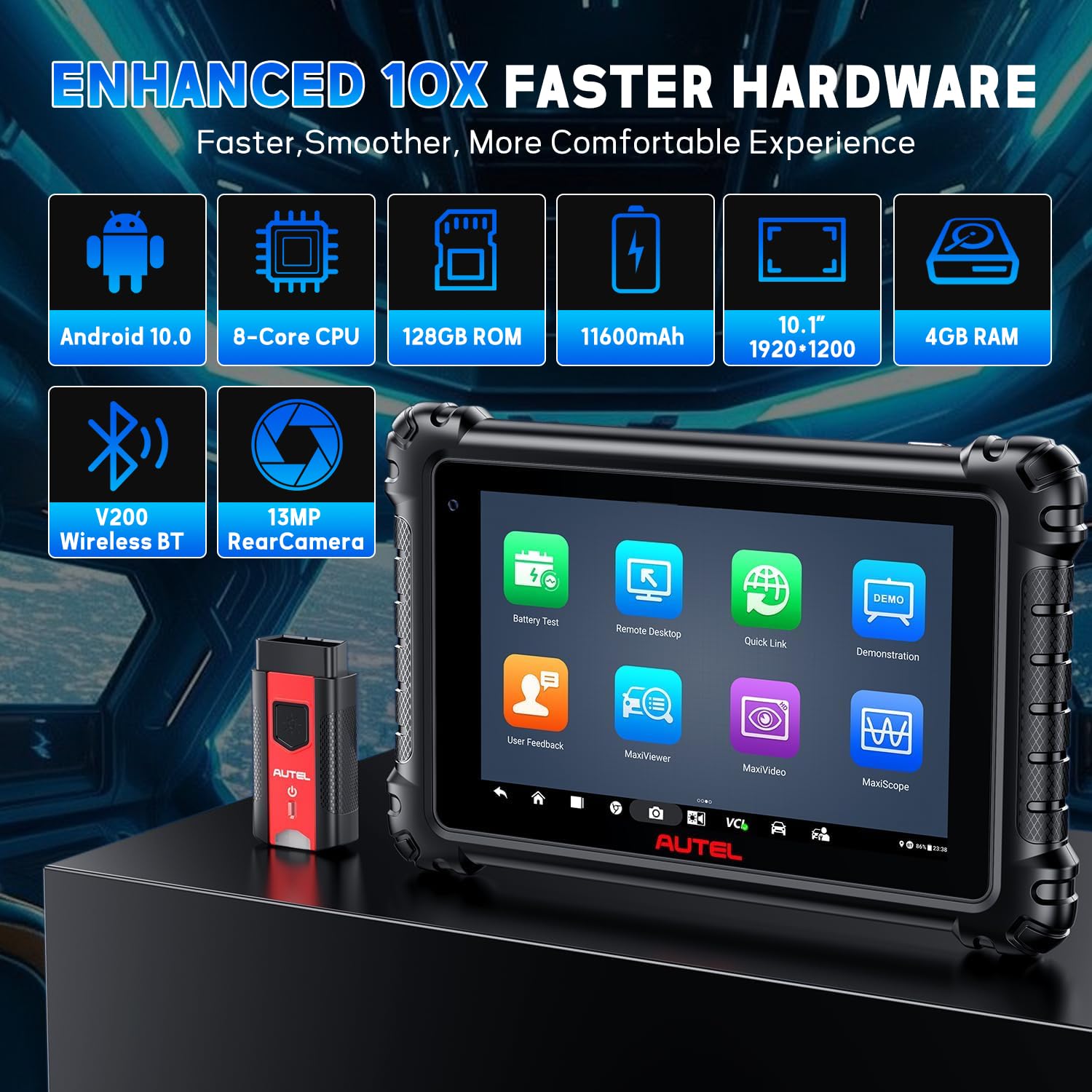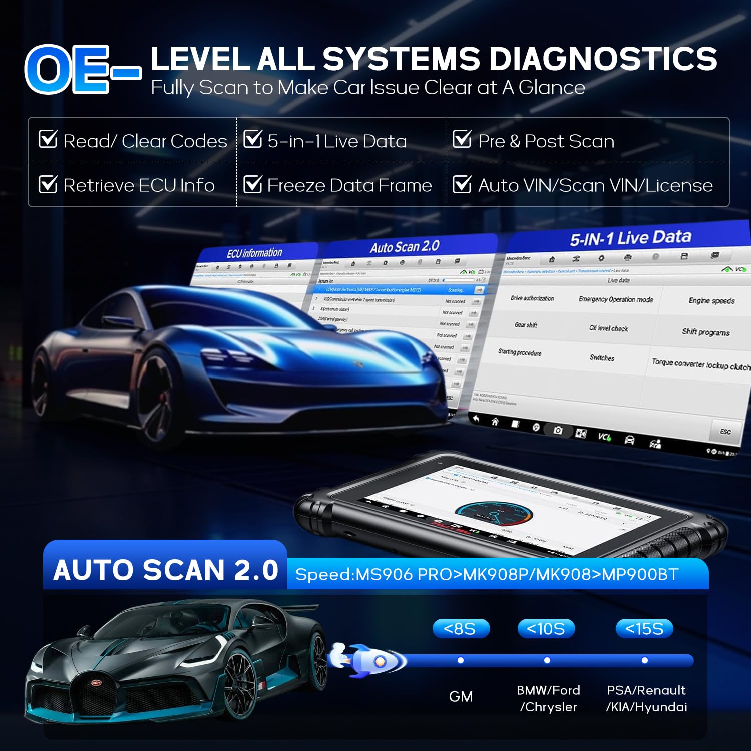 Autel MaxiSys MS906 MAX da un gran paso en hardware y software. Velocidad de diagnóstico 10 veces más rápida: Android 10.0 OS, CPU Octa-Core, Batería de 116000mAh, pantalla de 10 pulgadas 1920 1200, Memoria de 4+128GB, WIFI 5G y 2.4G, Cámaras de 16MP y 5MP, etc. Características de primer nivel: Codificación/Adaptación de ECU de nivel Smith; Más de 3000 Pruebas Activas; 40+ Servicios de Reinicio; DoIP y CAN FD; Guía VAG; Escaneo Pre y Post; Impresión WiFi; 15,000 automóviles 1996-2024-2025. Además, con la tecnología más reciente Auto Scan 2.0 de 2025, MS906 PRO realiza el escaneo en segundos. Además, cuenta con Codificación ECU avanzada, pruebas activas bidireccionales, servicio reconectado y mucho más. ¡La herramienta de diagnóstico de coche MS906MAX puede resolver el 99% de los problemas de mantenimiento de rutina!