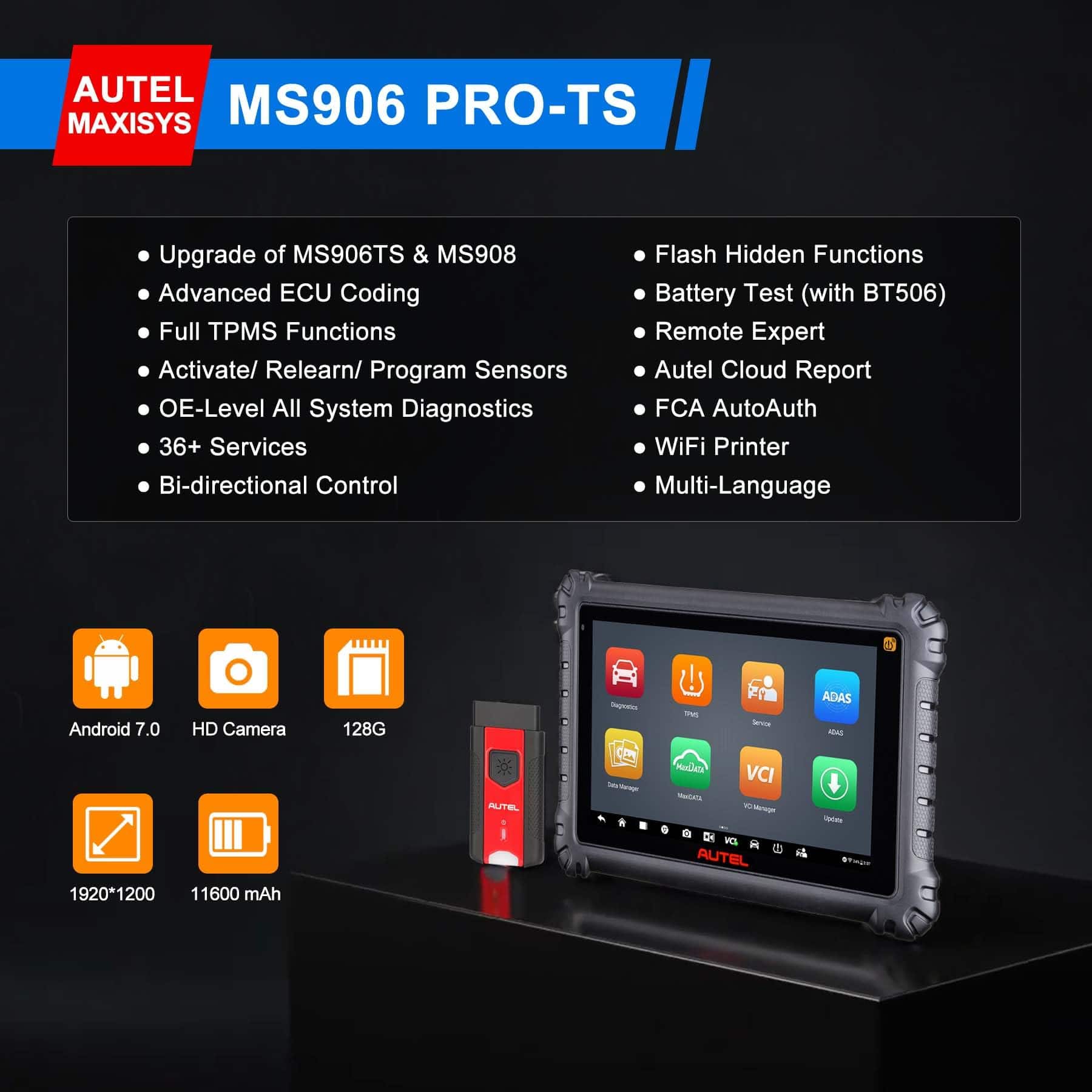 1. Autel MaxiSYS MS906 Pro-TS, Actualizado de MS906 PRO, MP900-TS, MS906TS, MS906BT Un avanzado escáner de diagnóstico de automóviles compatible con vehículos estadounidenses, asiáticos y europeos de 1996 en adelante: Codificación en línea de la ECU, Funciones TPMS completas, Diagnósticos de Todos los Sistemas Originales (igual que Elite), 36+ Servicios, 3000+ Pruebas Activas, Identificación de ADAS, Leer/Borrar Códigos, Ver Datos en Vivo/Instantáneas, FCA AutoAuth, DoIP/CAN FD, Informe en la Nube, Impresora WiFi, Experto Remoto, Escaneo Pre/Post, etc. 2. Mejor servicio de TPMS que MS906TS/MK808S-TS/MP808S-TS/MP808TS/MK808TS/MX808S-TS, Mismo que MK906 Pro-TS La herramienta de escaneo Autel MS906 PRO-TS integró el módulo de antena TPMS para realizar un completo servicio de TPMS: Activar todos los sensores TPMS conocidos, 4 Formas de Programar los Sensores MX (433MHZ/315MHZ), Reaprender el 99% de los Sensores, Un Paso para el Chequeo Completo de TPMS, Apagar la Luz de TPMS, Recuperar los Sensores OEM en Segundos, Diagnóstico más profundo de TPMS, Retrofit de TPMS para instalar el módulo TPMS en el tablero. 3. Codificación y Adaptación Avanzadas de la ECU Igual que Elite/MS908S Pro/MK908/MK908P, el escáner de diagnóstico profesional MaxiSYS MS906Pro-TS es capaz de asignar codificación en línea de la ECU para permitir la reprogramación de datos adaptativos a componentes específicos después de la reparación o reemplazo para Toyota, BMW, VW, Honds, Nissan, Chrysler, Hyundai, infiniti, etc. El MS906 Pro TS puede desactivar características molestas, actualizar funciones ocultas para mejorar el rendimiento del automóvil. 4. 36+ Servicios 36+ funciones especiales calientes empoderan al MS906Pro-TS para realizar un mantenimiento profundo y completo, incluyendo Aceite, EPB, SAS, ABS, BMS, TPMS, Acelerador, etc., convirtiendo al escáner en una herramienta confiable y profesional utilizada por técnicos o ocupadas tiendas de reparación de automóviles. Cobertura extensa al 99% de los vehículos compatibles con OBD II/EOBD están disponibles para el escáner MS906 PRO-TS. NOTA: El MS906 PRO-TS no puede funcionar en todos los vehículos, por favor verifique la compatibilidad a través de mensaje o mobobaohe@163. Com . 5. Control Bidireccional/ Pruebas Activas Con control bidireccional, puede enviar comandos a las ECUs y controlar/monitorizar la operación de PDM, SMF, RSM, TCU y otros módulos a bordo para localizar rápidamente y de manera precisa los problemas. La herramienta de escaneo bidireccional MS906 Pro-TS puede realizar pruebas activas reales, como ABS, ventanas, puertas, solenoides, válvulas, limpiaparabrisas, lámpara delantera, etc., ayudándole a encontrar rápidamente las piezas defectuosas y señalar los problemas defectuosos. NOTA: El MS906 PRO-TS no puede funcionar en todos los vehículos, por favor verifique la compatibilidad primero. 6. Diagnóstico de todos los sistemas con Escaneo Automático 2.0 El escáner de diagnóstico de automóviles MS906 Pro-TS escanea todos los sistemas disponibles para descubrir esos problemas invisibles, incluida la identificación de ADAS (realiza calibraciones de ADAS con la compra de una actualización de software y un sistema de marco). Combinado con Auto Scan 2.0, maximiza la velocidad de escaneo y se sumerge en el segundo nivel de escaneo, la velocidad de escaneo promedio es 3 veces más rápida que la de competidores: GM 8s, BMW Ford VAG Chrysler 10s, etc. 7. Funciones Expandidas Autel MS906Pro-TS escáner de diagnóstico OBD2 admite varias funciones expandidas: Informes y Datos basados en la Nube Expertos Remotos Impresora WiFi Informe de Escaneo Pre y Post y Compartir a través de código QR, SMS, Correo Electrónico Diagnóstico en lugares oscuros y estrechos con MV105/108 Pruebas de batería, arranque, sistema de carga con BT506 Guía VAG para VW, Audi, Skoda, Seat, Man LD, Bentley FCA Auto Auth para autos FCA en/después de 2018 (Chrysler/JEEP/ Dodge/Fiat), para Renault SGW 2015+ Auto Auth.