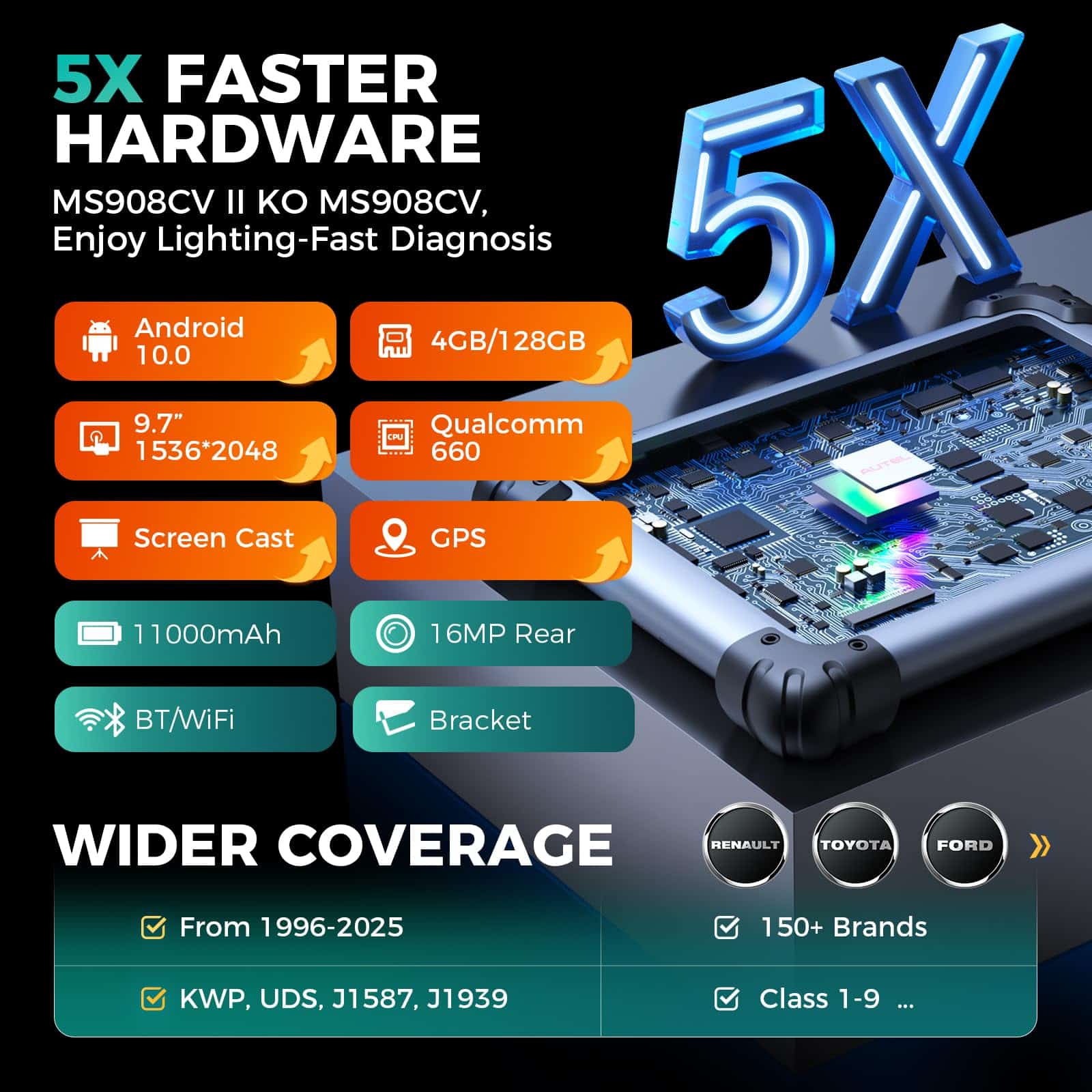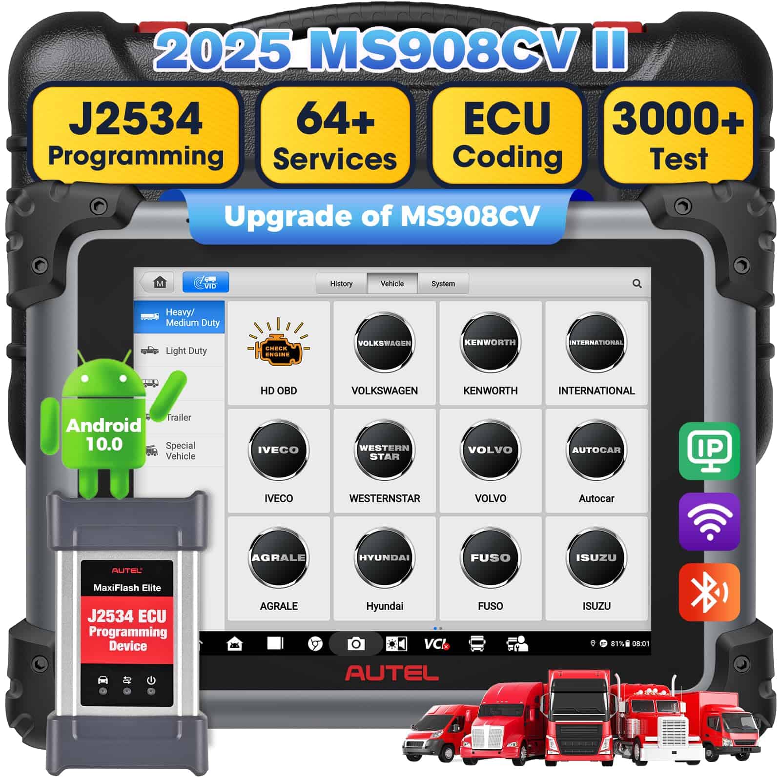1. Autel MS908CV II: Igual que MaxiSYS MS909CV, mejorada de MS908CV/MS906CV Autel Maxisys MS908CV II es la versión 2025 mejorada de MaxiSYS MS908CV, que tiene el mismo diagnóstico y servicios destacados y cobertura de vehículos que MaxiSYS MS909CV: Android 10 rápido, 4+128GB más grande y 15000mAh duradero. Las últimas tecnologías y actualizaciones proporcionan potencia a prueba de futuro para más vehículos comerciales/pesados (clase 1-9). El escáner de camiones pesados MS908CV II viene con mejoras en 64+ servicios, agrega 3000+ pruebas activas, mejora la codificación de la ECU y programación J2534 para una mejor multitarea.