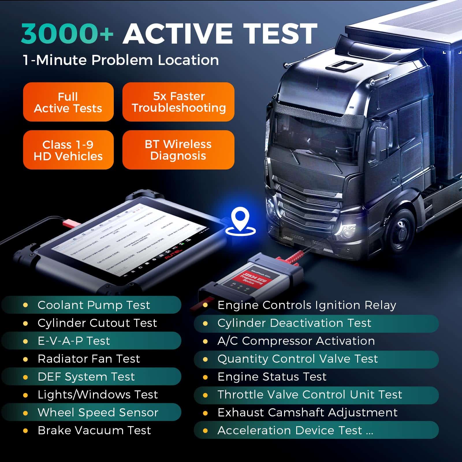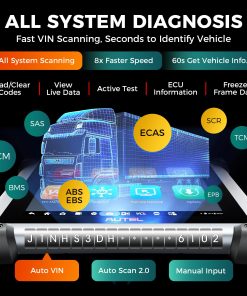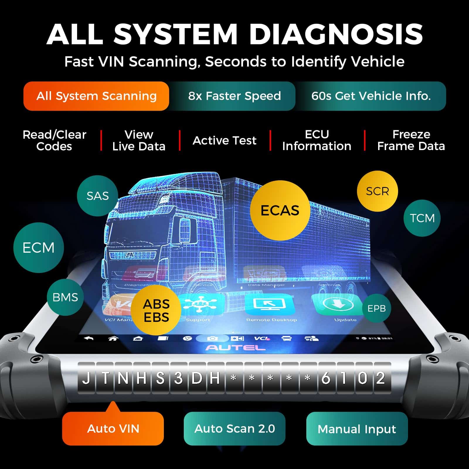 5. Diagnóstico OE de Todos los Sistemas y Auto Scan 2.0 Trabaja en 150+ marcas de vehículos comerciales, MS908CV II realiza la simplificación de todos los procedimientos como prioridad, ejecuta verificaciones completas para sistemas de vehículos comerciales complejos como ECAS, ABS/EBS, DPF/SCR, lee DTCs para localizar el fallo, borra los DTCs para apagar la MIL, recupera datos en vivo para conocer los detalles. Las 3000+ pruebas activas actúan de manera más precisa pero rápida en la ubicación de problemas sin desmontar partes voluminosas. Incluso los problemas menores pueden ser capturados/confirmados.