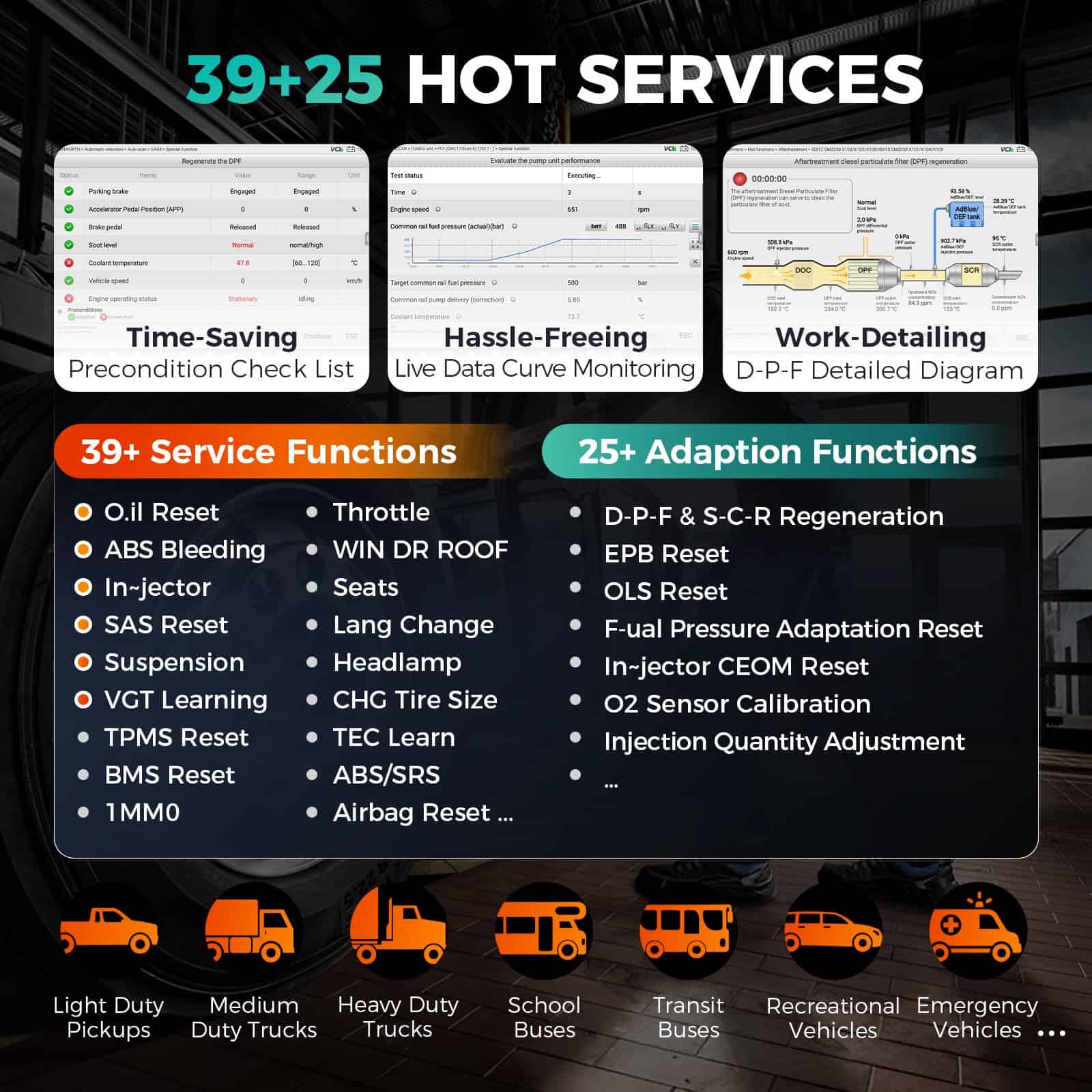 2. 39+ Servicios Destacados y 25+ Adaptaciones Una opción asequible para competir con los escáneres OEM con funciones más avanzadas y un presupuesto menor. Autel MS908CV II cuenta con 39+ servicios y 25+ adaptaciones para 150+ marcas que son fáciles de navegar y más destacados que otras herramientas de escaneo de diagnóstico CV. Ayuda a resolver más problemas especiales de vehículos pesados incluyendo reinicio de aceite, regeneración de DPF, reinicio de SCR, aprendizaje VGT, reinicio de SAS, codificación de inyectores, suspensión neumática, purga de ABS, etc.