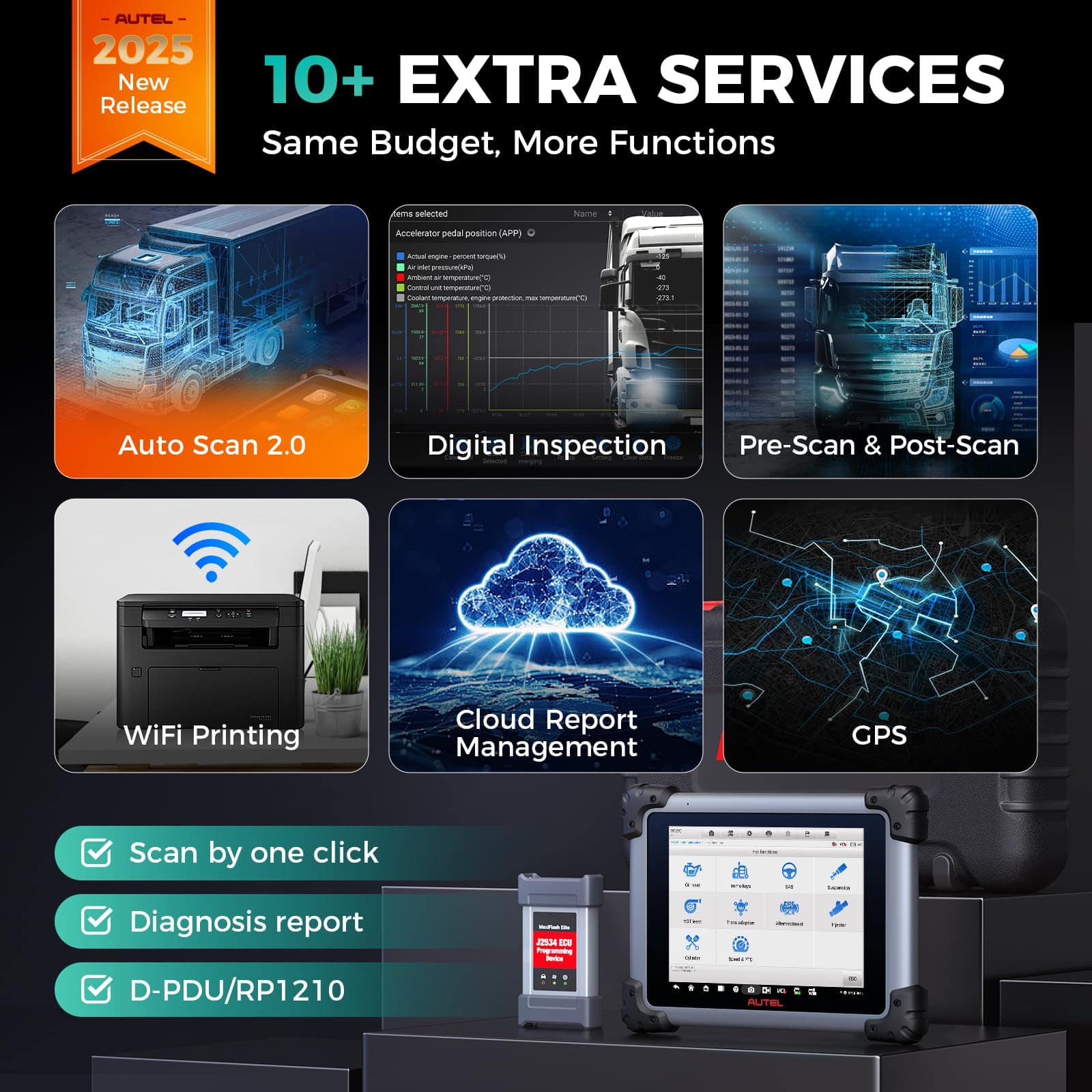 6. Cobertura más amplia, más servicios El escáner de camiones Autel MS908CV II trabaja en 150+ marcas de camiones y vehículos comerciales hasta el año 2024/2025, incluyendo camiones ligeros/pesados (clase 1-9), remolques, autobuses, vehículos especiales y vehículos agrícolas y de construcción recientemente agregados. Sirve a 150+ marcas de CAPACITY, CATERPILLAR, DAEWOO, FORD, FOTON, VOLVO, WESTERNSTAR, etc. Funciones prácticas como GPS, Auto Scan 2.0, Videoscopio, Impresión WiFi, Informe en la nube también hacen un gran favor para mejorar la eficiencia y reducir la complejidad del diagnóstico.
