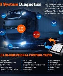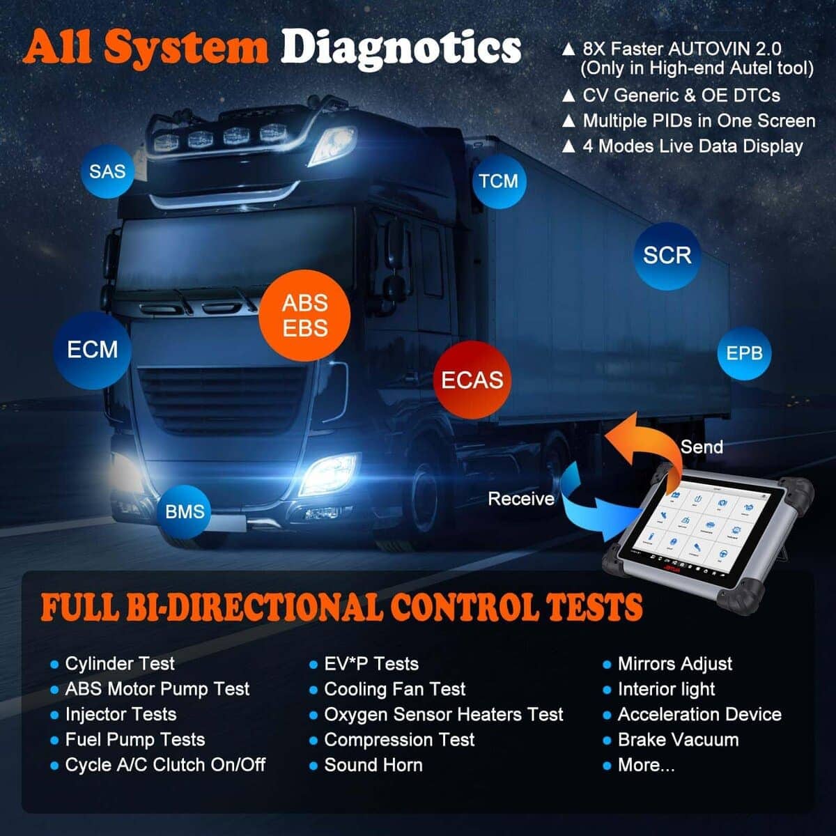 5. Diagnóstico de Nive OE en Todos los Sistemas Autel MaxiSys MS908CV II es una herramienta de diagnóstico de camiones pesados que realiza diagnósticos de todos los sistemas en casi todos los camiones diésel compatibles con los protocolos OBD HD estándar. Le permite recuperar información de diagnóstico, ver parámetros de datos en vivo y realizar pruebas activas. La aplicación de Diagnósticos puede acceder al módulo de control electrónico (ECM) para varios sistemas de control del vehículo, como motor, transmisión, ABS/EBS, SRS, D~PF/S~CR, etc.