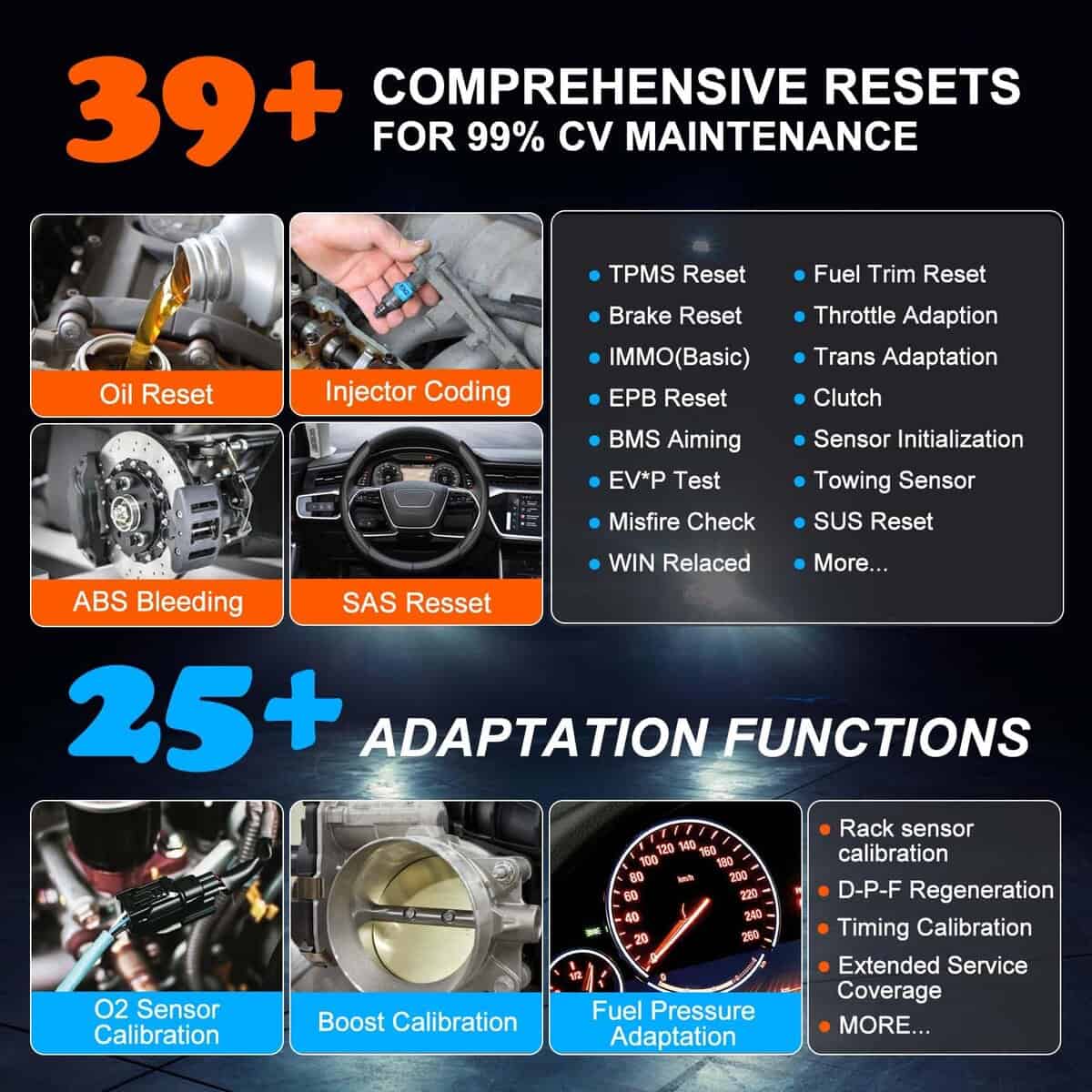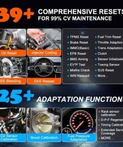 3. 39+ Servicios Principales y 25+ Adaptaciones El escáner para camiones pesados MS908CV II es su solución integral para manejar el 99% de las reparaciones diarias de CVs. Cuenta con 39+ servicios como: D, P, F, Reinicio de aceite, Codificación de inyectores, Sangrado de ABS, SAS, Acelerador, Cilindro, etc. y 25+ adaptaciones para CVs: Calibración de aumento, Calibración de sensor de barra, Calibración de tiempo, Adaptación de presión de combustible, etc. Los servicios son específicos para cada vehículo, por favor, verifique la compatibilidad antes de comprar.