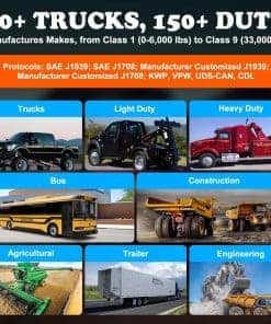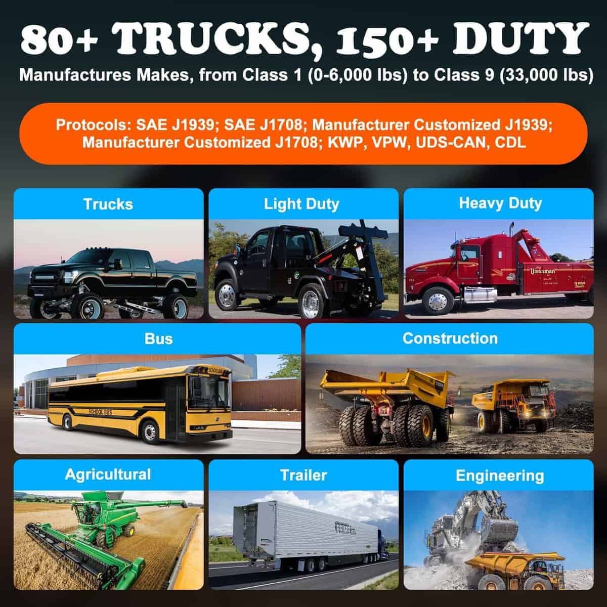 6. Amplia Cobertura de Vehículos El escáner para camiones MS908CV II es ampliamente aplicable a vehículos CV que incluyen camionetas ligeras, camiones de carga mediana, camiones de carga pesada (clase 1-9), remolques, autobuses escolares, vehículos recreativos, vehículos de emergencia y vehículos agrícolas y de construcción recientemente añadidos. Sirve a 150+ marcas de Freightliner, Caterpillar, Daewoo, Kenworth, Peterbilt, International, Volvo, etc. Diga adiós al llevar múltiples escáneres para camiones pesados para diferentes marcas.