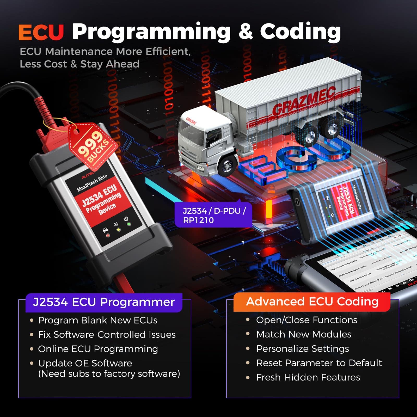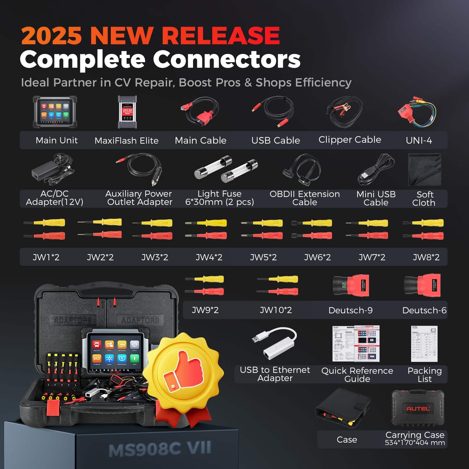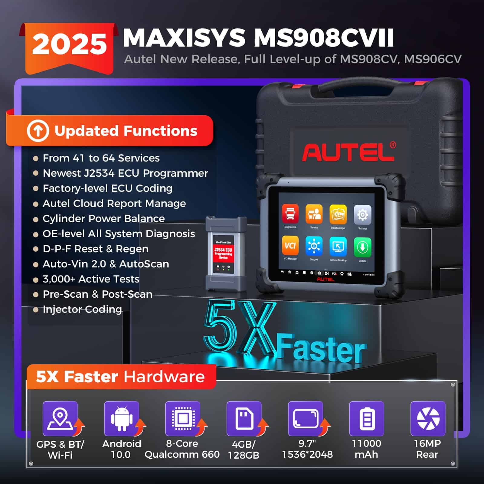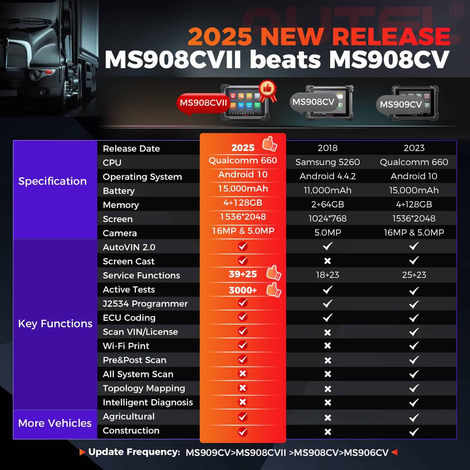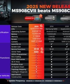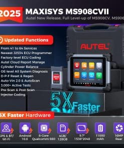 1. 2025 MS908CV II, Igual a los Escáneres OEM Autel en 2025 lanzados Autel Maxisys CV MS908CV II, actualizándose desde MS906CV, MS908CV con una cobertura ampliada de CVs (clase 1-9) y todo el menú de servicio nivelado: Codificación de ECU y Programa J2534, 64+ Servicios Activos, 3000+ Controles Bidireccionales de CVs y más; respaldado por especificaciones superiores (Android 10.0/8-Core/9.7″, 1536 2048/4+128G) que acelerarán tus reparaciones 5 veces más rápido! ¡El precio es increíble: 2749 dólares! ¡Sólo 1/5 de los costos de un escáner de camiones pesados OEM. 2. 64+ Servicios Activos > MS906CV, MS908CV Este escáner de camiones pesados es tu solución única para manejar el 99% de las reparaciones diarias de CVs. Ofrece 39+ servicios como Reinicio de Aceite/EPB/Sangrado de Frenos/1MM0/Inyector/Acelerador, etc. (> MS906CV, MS908CV), y 25+ adaptaciones para CVs. Las actualizaciones son frecuentes (mensuales e incluso semanales) para satisfacer más necesidades del mercado. ¡Nunca estarás desactualizado! 3. Codificación de ECU y Programación J2534 Autel Maxisys CV MS908CV II tiene capacidades de codificación completas para hacer ajustes de ECU como para el Límite de Velocidad en Carretera (RSL). La copia de seguridad/restauración de datos de ECU fiable garantiza un procedimiento exitoso. Mejor aún, con la caja J2534 incluida (2000 dólares), puedes hacer flasheo/programación/actualización de software de ECU (necesitas suscripción al software OE). El valor es difícil de igualar por muchos escáneres de camiones pesados similares. 4. Cobertura de 99% de Autos/CVs & AutoVIN 2.0 Con una cobertura líder para 80+ principales marcas de automóviles/150+ marcas/10,000+ modelos, este Autel Maxisys CV MS908CV II trabajará en casi cualquier camión semi pesado, ligeras y tareas robustas que lleguen a tu taller. El software se actualiza continuamente para capacidades expandidas y compatibilidad con modelos más nuevos. AutoVIN 2.0 Inteligente & AutoScan (2006+) te proporciona un escaneo rápido en segundos; 3 veces más rápido que esos escáneres de camiones semipesados con ECU J2534 con AutoVIN de versión antigua. 5. 3000+ Controles Bidireccionales de CVs A diferencia de la mayoría de los escáneres de diagnóstico diesel bluetooth para vehículos comerciales que sólo pueden realizar un control bidireccional limitado, este Autel Maxisys CV MS908CV II ofrece pruebas activas completas 3000+ cubriendo el 99% de CVs principales, como Prueba de Corte de Cilindros, Prueba de Compresión de Cilindros, Prueba de Componentes Electrónicos a Bordo; consulta la página A+ para más detalles. La operación es tan suave que puedes identificar rápidamente el área defectuosa en un abrir y cerrar de ojos.