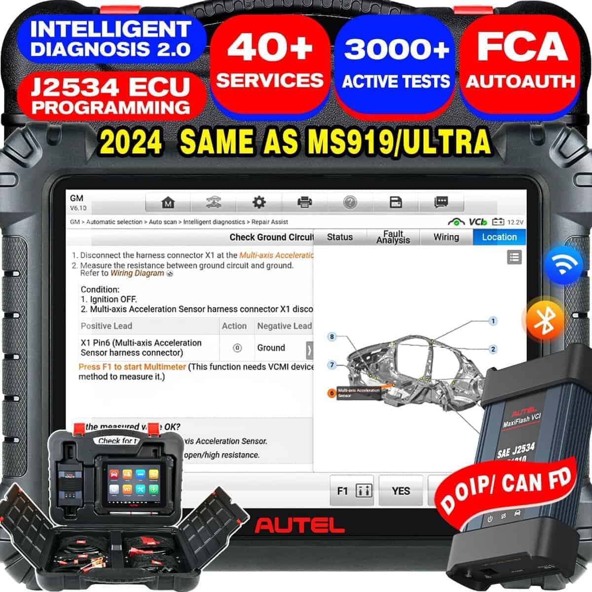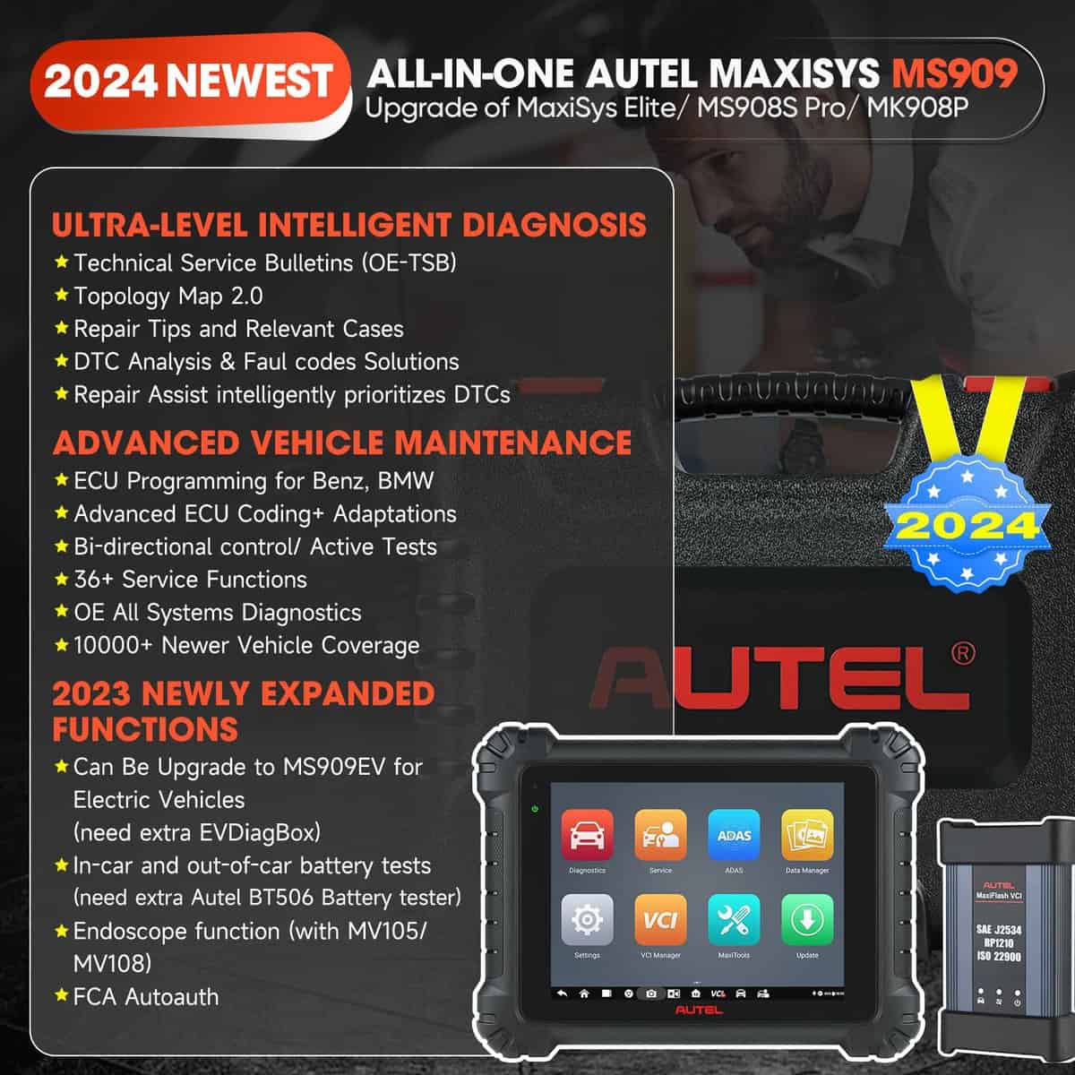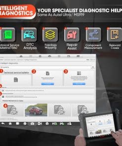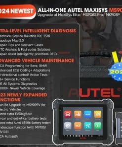 El escáner Autel MaxiSys MS909 es una herramienta de diagnóstico inteligente con las mismas funciones inteligentes de diagnóstico y reparación que la Autel Ultra/ MS919 originales, pero a un menor costo. La MS909 puede mejorar la eficiencia de reparación de su taller en un 90% al ofrecer funciones de diagnóstico y reparación inteligentes más allá de las de fábrica originales. Ofrece boletines TSB OEM, Análisis de DTC, Asistente de Reparación, Consejos de Reparación, Casos Relevantes y Mapeo de Módulo de Topología Revolucionario. Además, cuenta con Programación y Codificación Avanzada de la ECU, 36+ Servicios y Control Bidireccional, así como cobertura de protocolos actualizados y nuevas funciones agregadas en 2024 como FCA SGW, Prueba de Batería, Expertos Remotos y más.