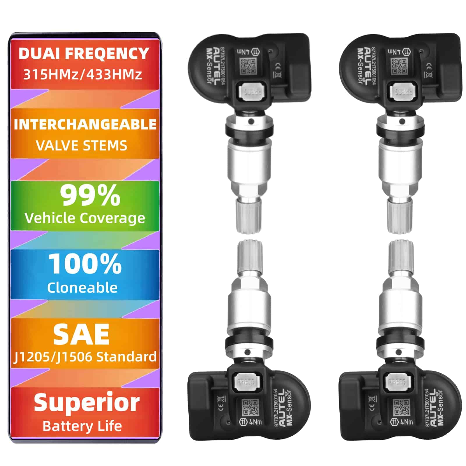 Autel MX-Sensor 2 En 1 (315 + 433MHz) Nivel OE 100% Clone-able Sensor Programable Ajuste a 98% de Vehículos de Pistas con Válvulas de Metal para TPMS, es un sensor universal programable inteligente y eficiente especialmente diseñado para el reemplazo de sensores sin una cobertura máxima de aplicaciones, facilidad de uso, ajuste de nivel OE, rendimiento y confiabilidad, ayudará a los usuarios a economizar el costo del trabajo de diagnóstico y aumentar enormemente la eficiencia de la reparación. Especificación: 1. Vida útil de la batería: 5 años 2. Temperatura de funcionamiento: -40 C 125 C 3. Temperatura de almacenamiento: -40 C t 125 C 4. Humedad de funcionamiento: 90% 5. Frecuencia de funcionamiento: 315 MHz~433MHz 6. Rango de presión máx.: 800 kPa 7. Rango de lectura de temperatura: -40 C 125 C 8. Precisión de lectura de temperatura: 5 C 9. Precisión de lectura del sensor G: 15% 10. Potencia de transmisión: 5-8dBm 11. Batería: 3.0 V 12. Dimensiones: Aprox. 42.4 24.1 16.0 mm 13. Peso del sensor sin válvula: 13g Esta versión incluye una herramienta extra EL-50448 TPMS que le proporciona funciones de reajuste y reinicio de EL-50448 TPMS. La herramienta de reajuste TPMS funciona en la mayoría de los vehículos GM (desde 2006-2019) equipados con 315/433 MHz, muy potente y fácil de usar. Dispositivo pequeño, función potente. Con este sencillo dispositivo, puedes reajustar fácilmente tu GM TPMS por ti mismo en lugar de ir a la tienda del concesionario. Ahorra tanto tiempo como dinero.