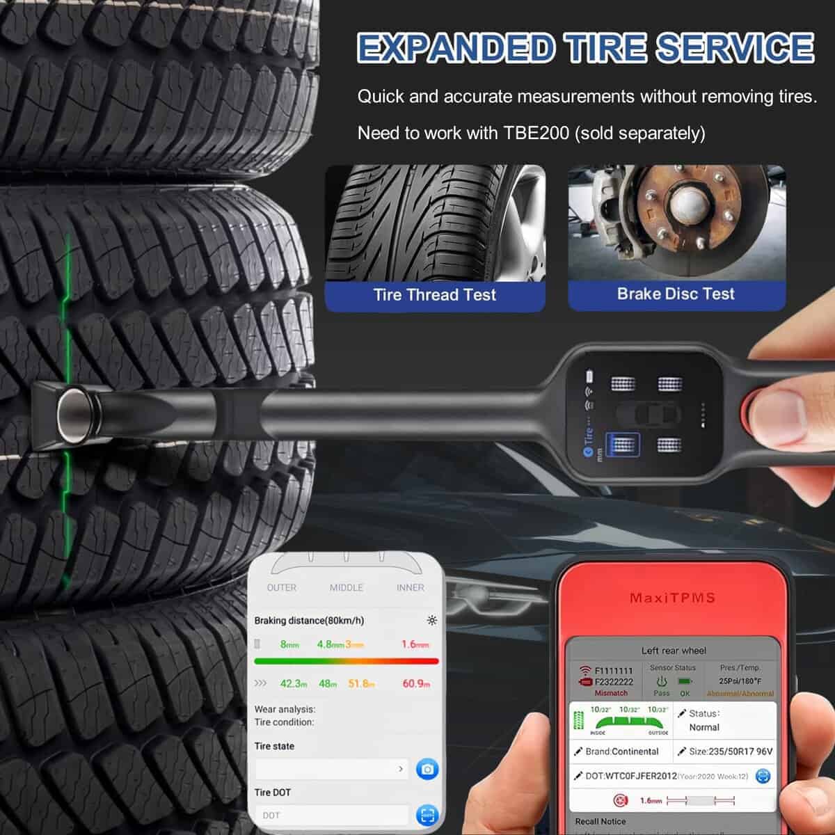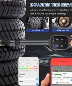 5. Compatible con Autel TBE200 para la Evaluación de la Salud de los Neumáticos: La herramienta especializada de TPMS de Autel ITS600 Pro es compatible con Autel TBE200 para un análisis preciso de la condición de los neumáticos. Después de emparejarse con el TBE200, puede leer el Número DOT del neumático, realizar un análisis preciso de la profundidad del dibujo y el desgaste del disco de freno, y obtener el informe de prueba más completo que incluye la salud del TPMS, la profundidad del dibujo y el desgaste del disco de freno y consejos de reparación. El Autel TBE200 se debe comprar por separado.