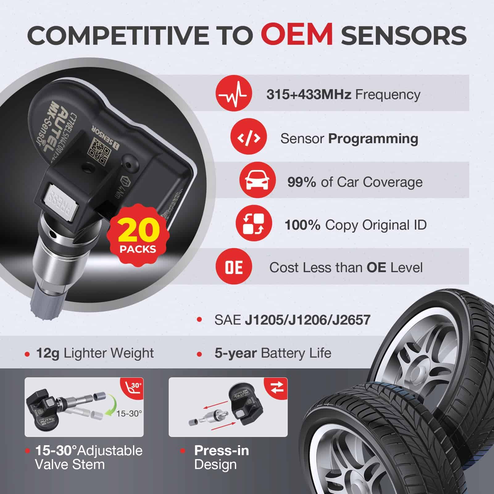 5. Diseño Duradero y Resistente Equipados con una batería de nivel automotriz para una vida más larga y una válvula de vástago de aluminio reemplazable, los sensores de Autel son resistentes al frío y al calor, a la corrosión y compatibles con el estándar de pruebas SAE J1205/J1206.