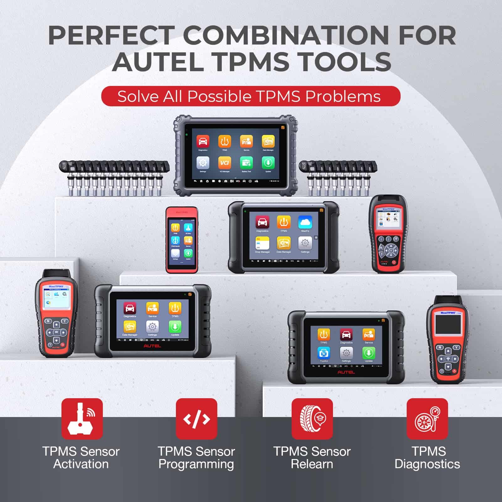 4. Sensores MX Programables de Autel, Alternativa para Sensores Originales La potente frecuencia de 315/433MHz logra una programación inalámbrica rápida a los sensores MX TPS218. Cuando se trabaja con las herramientas de programación Autel TS408/TS508/TS608/ITS600/MK808TS/MS906Pro-TS (se venden por separado), hasta 20 sensores MX pueden programarse perfectamente al mismo tiempo, brindando gran comodidad para reemplazar sensores OE/otros rotos o con batería baja. Nota: SOLO se pueden programar sensores de Autel.