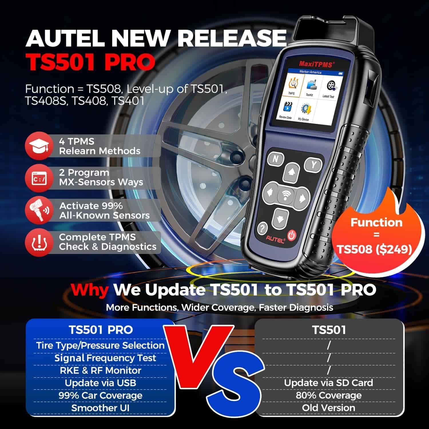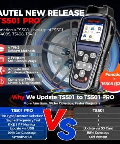 Autel MaxiTPMS TS501 PRO es una herramienta de programación de TPMS de última generación que ofrece una amplia gama de funciones para maximizar su capacidad de diagnóstico de TPMS. Actualizado de la versión anterior TS501, este modelo PRO incluye mejoras significativas que lo convierten en un compañero confiable para los entusiastas de los automóviles y técnicos profesionales por igual. Gracias a su hardware y software mejorados, TS501 PRO brinda una cobertura más amplia y funciones adicionales a un precio más asequible.
