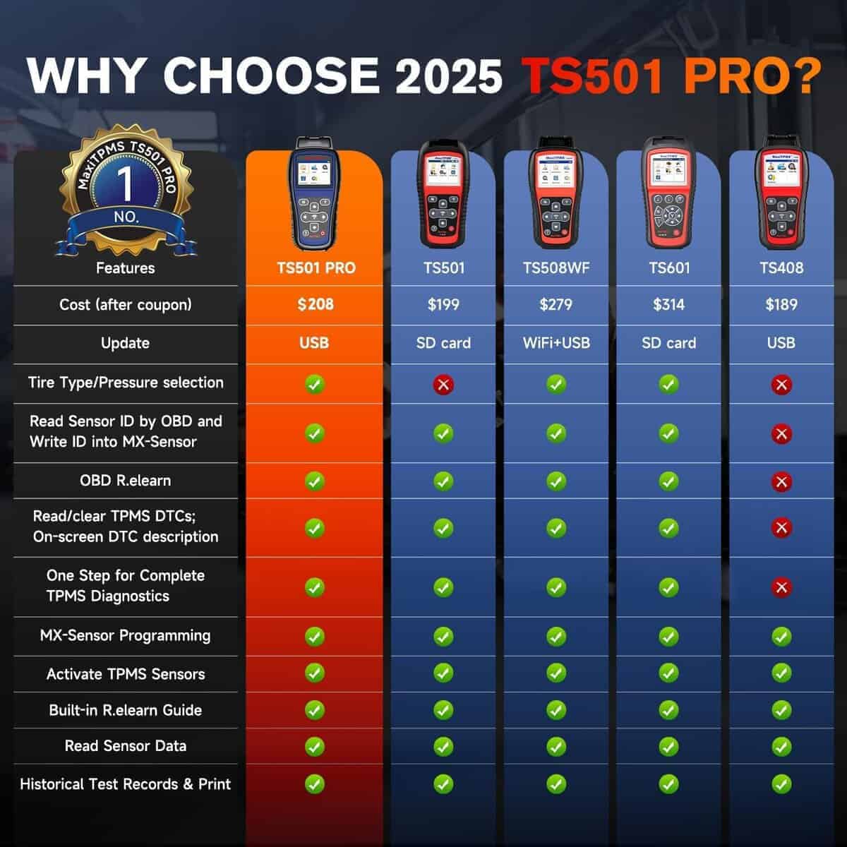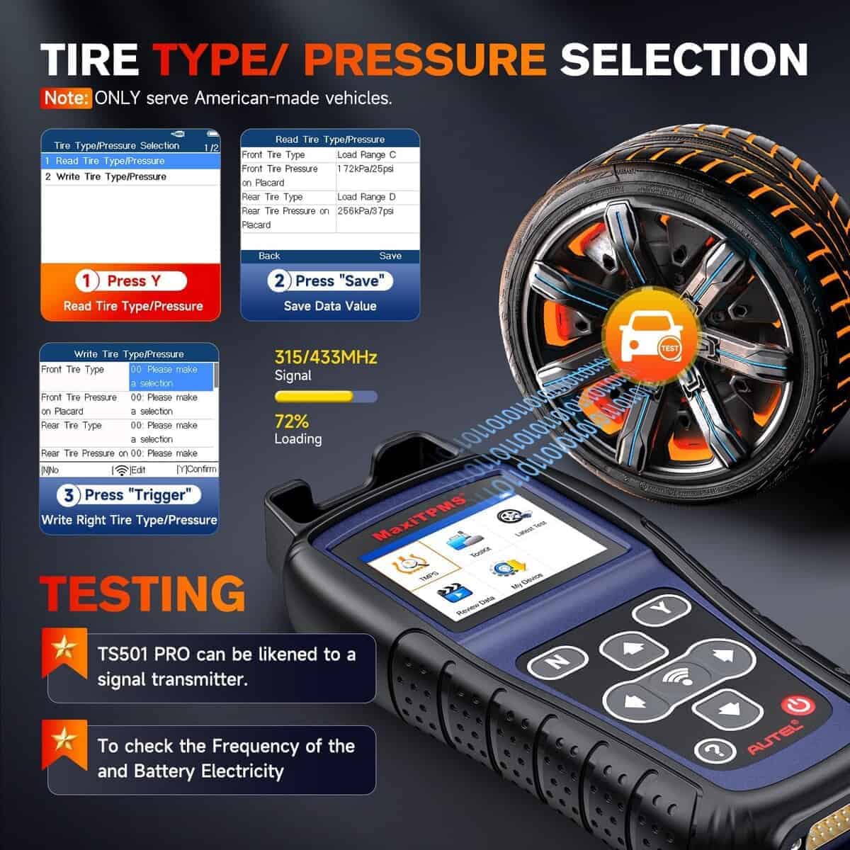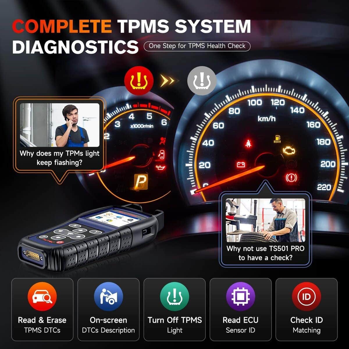 Autel MaxiTPMS TS501 PRO es la herramienta de programación TPMS definitiva. Con una amplia cobertura de vehículos, incluye opciones completas de servicio como programación de sensores, activación de sensores, reset de TPMS, diagnóstico de salud, prueba de frecuencia, selección de tipo/presión de neumáticos y mucho más. Perfecto para programar Autel MX-Sensors, el TS501 PRO es una herramienta imprescindible para cualquier entusiasta de automóviles. Registre su TS501 PRO y actualice todo el software antes de usarlo para aprovechar al máximo sus funciones. ¡No se limite a 10 usos, regístrelo!