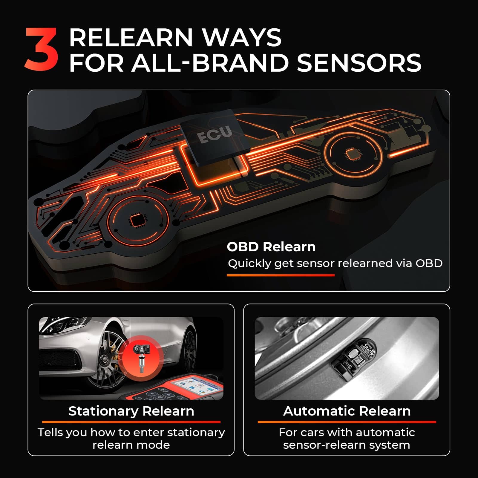 2. Activar y Reaprender el 99% de los Sensores TPMS Actualización de TS408S/TS501 PRO, la herramienta de reprogramación TPMS Autel TS508WF puede activar y reaprender de forma inalámbrica todos los sensores TPMS OE o de mercado secundario. TS508WF puede recuperar datos del sensor TPMS como ID del sensor, Presión de Llantas, Temperatura de Llantas, Batería del Sensor, Posición del Sensor, etc, y le proporciona 3 formas de procedimientos de reaprendizaje en la herramienta: 1. Reaprendizaje Estacionario. 2. Reaprendizaje Automático. 3. Reaprendizaje por OBD (TS408 no lo soporta).