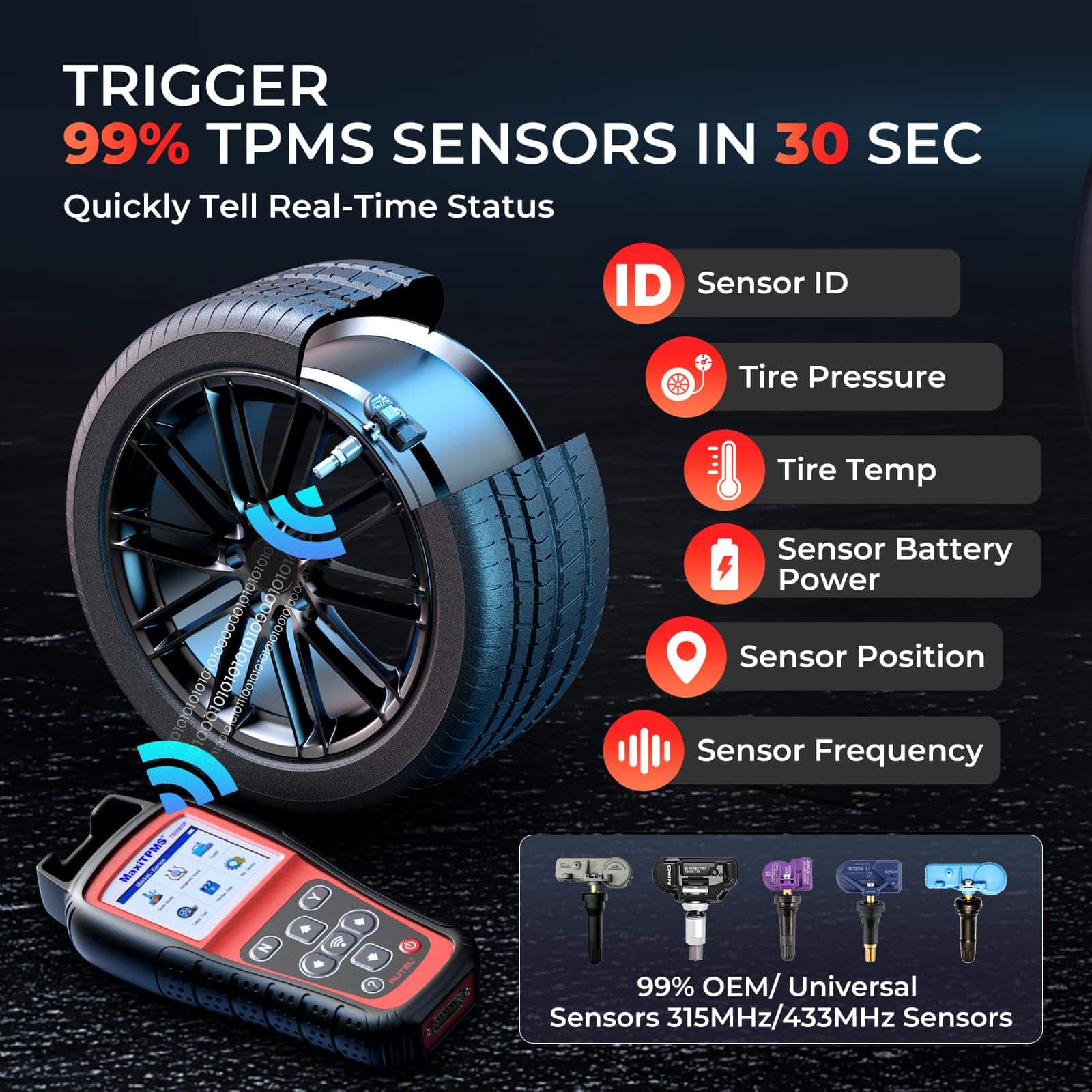 4. Completa Herramienta de Escaneo de Sistema TPMS Autel TS508WF herramienta de diagnóstico TPMS activará todos los sensores TPMS, leerá datos de sensores, completará el diagnóstico TPMS y la verificación de la salud de TPMS de manera integral en un solo paso, y leerá/borrará códigos DTC de TPMS así como descripción de DTC en pantalla; Escanear ID del sensor TPMS y copiar ID en MX-Sensor; Ingresar manualmente el ID OE en MX-sensor; Programar MX-Sensor creando automáticamente ID del sensor; Reaprendizaje por función OBD con guía de procedimiento de reaprendizaje en la herramienta, etc.
