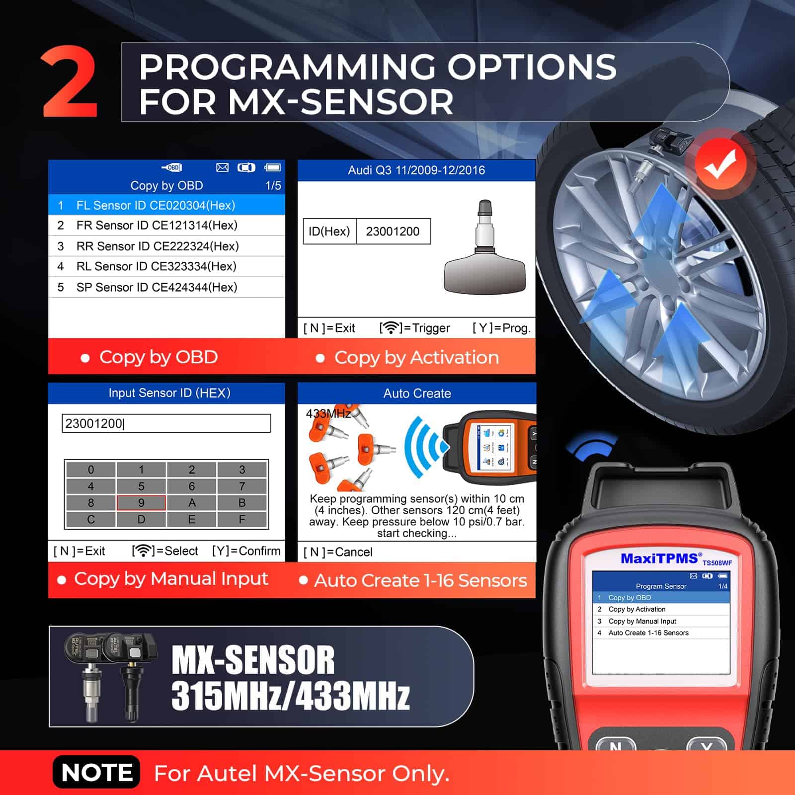 3. 2 Formas de Programación TPMS para Sensores Autel MX-Sensors TS508WF Herramienta de Programación TPMS permite a todos los entusiatas de los autos programar datos de sensores a los Autel MX-Sensors (315/433MHz) con facilidad, ahorrándole dinero y viajes al concesionario. TS508WF cuenta con 2 opciones de programación profesionales: Por OBD y Crear Automáticamente 1-16 Sensores para reemplazar el sensor defectuoso con poca vida de batería o uno que no esté funcionando correctamente. Nota: TS508WF SÓLO puede programar Autel MX-sensors. NO puede programar sensores de otras marcas.