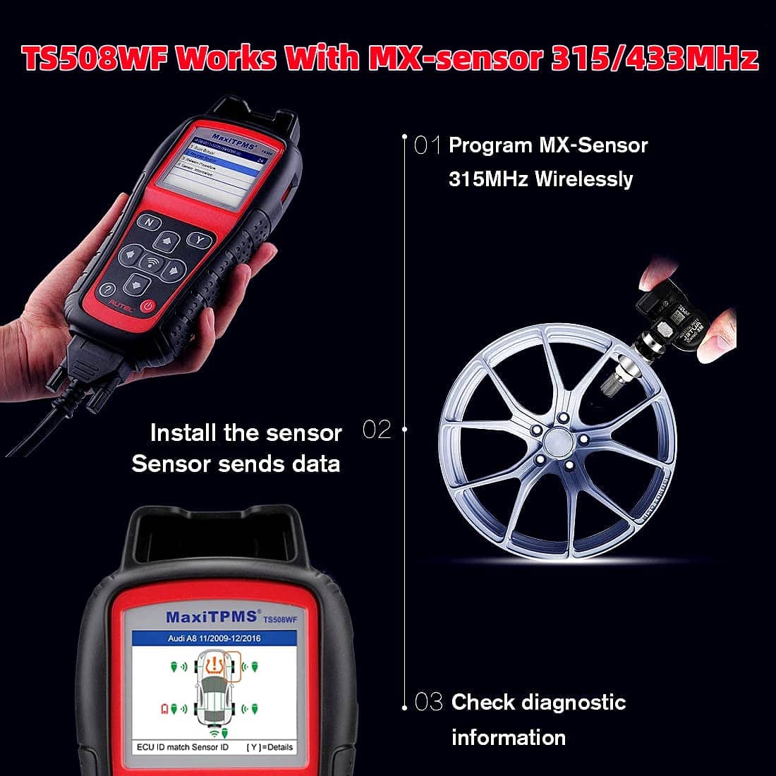 Autel TS508 cuenta con función de diagnóstico de TPMS. Se utiliza para detectar problemas relacionados con TPMS. Puedes revisar problemas relacionados con los sensores, desinflamiento de los neumáticos y la rotación de las ruedas. TS508 puede leer o borrar DTCs de TPMS, descripción de DTC en pantalla para realizar una búsqueda de DTC. Puede ayudarte a encontrar problemas con el sistema TPMS más rápido. Características de Autel MaxiTPMS TS508: Base de datos específica del vehículo (doméstica, asiática y europea) Selección automática de frecuencia para un escaneo rápido Dos modos de servicio TPMS para usar: Modo rápido para instalaciones rápidas diseñado para tiendas de neumáticos/ruedas; Modo avanzado para diagnosticar, reparar y reemplazar TPMS para talleres de reparación Pantallas de estado de TPMS para un diagnóstico fácil Muestra de emparejamiento ID en color Indicador de batería baja del sensor Notificación de código – procedimientos de reaprendizaje al toque del botón de ayuda Programación en lote – Programa múltiples sensores con un toque (hasta 16 sensores a la vez) La programación del vehículo ECU para aprender IDs y posiciones de los sensores Activa TODOS los sensores accionados magnéticamente, por frecuencia y por desinflamiento de los neumáticos utilizando señales de onda continua o modulada de 125 kHz Recibe señales de 315MHz y 433MHz Lee/escribe IDs de sensores desde la ECU del vehículo Lee/borra DTCs de TPMS y restablece la luz indicadora de mal funcionamiento Programa Autel MX-Sensors 315MHz o 433MHz de forma inalámbrica Verifica la entrada remota sin llave (Key FOB) para transmisiones Lee datos incluyendo IDs de sensores, presión de neumáticos, temperatura, estado de la batería. Número de pieza OEM e información de reaprendizaje Muestra diferentes procedimientos de reaprendizaje de sensores para diferentes sensores OEM. Información de sensores OEM