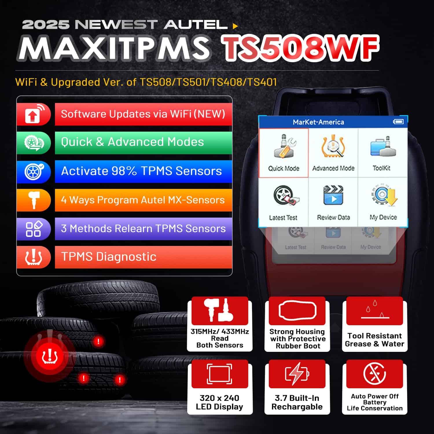 Por favor, lea cuidadosamente antes de comprar. Por favor, elija el TS508WF más nuevo de 2025 de la tienda autorizada de Autel: »Autel Choice», NO de »Wheels Plus More» ni de »The TPMS Store», ya que no son productos originales al 100%. Además, el producto que vendemos es la nueva versión 2025 TS508WF, mientras que el vendedor »Wheels Plus More» sigue vendiendo la vieja versión de TS508. Autel TS508WF es directamente actualizado desde TS508 y agrega actualización por Wi-Fi sobre la base de TS508, siendo la primera en proporcionar actualizaciones por Wi-Fi y solución TPMS todo en uno para todos. Ventajas de actualizar a través de Wi-Fi: Descarga de software más rápida que nunca. Es más conveniente actualizar, solo necesita estar en un entorno de Wi-Fi. Reduce las preocupaciones de que las actualizaciones se deben hacer con una computadora. Como la más nueva de 2025, Autel TS508WF ha empaquetado casi todas las funciones TPMS incluyendo la verificación de salud de TPMS de un paso, leer y borrar códigos TPMS, descripción de DTC en pantalla, restablecer la luz de… (truncated)