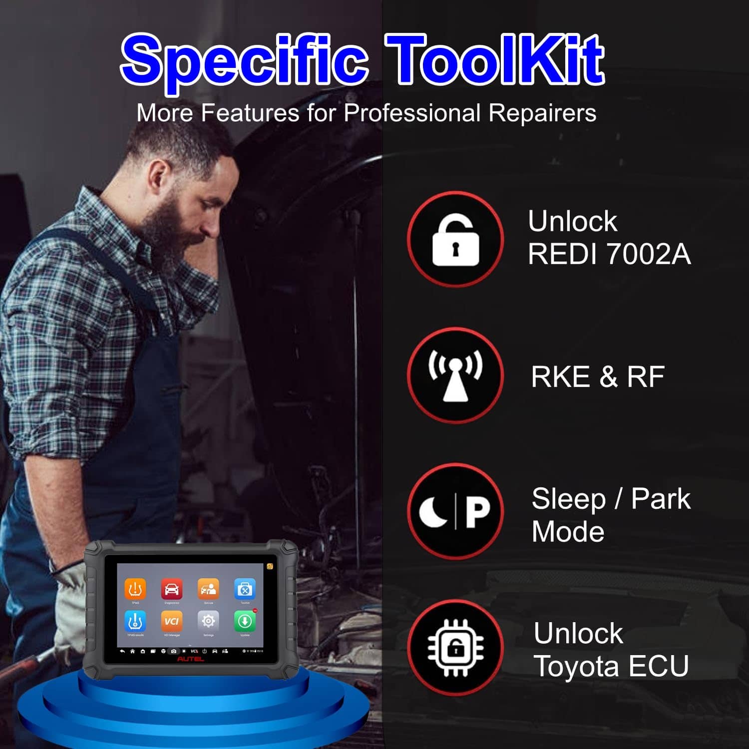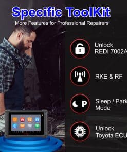 6. Exclusive TOOLKIT, Características Especiales de TPMS El escáner Autel TS900 presume de un conjunto de características distintivas que no se encuentran en dispositivos de TPMS anteriores como el MS906TS, TS508 o TS601. Su exclusivo TOOLKIT incluye varias funciones avanzadas como Check MX-Sensor ID, que muestra datos de los sensores MX, Desbloqueo REDI 7002A, Desbloqueo ECU Toyota, así como despertarlos y configurarlos en Modo de Estacionamiento. Estas características especializadas mejoran las capacidades de TPMS de la TS900.