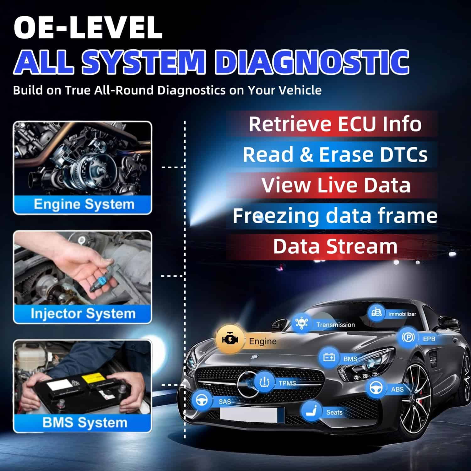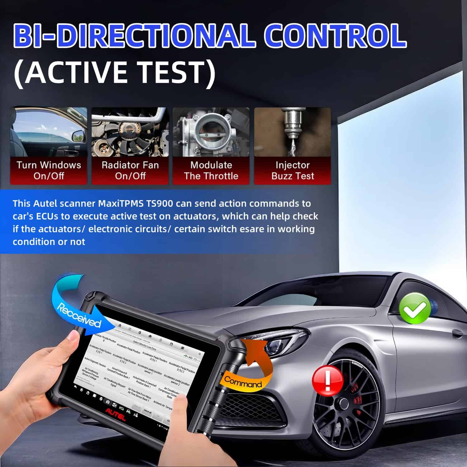 3. Prueba Activa OE-Nivel 3000+ La Autel TS900 está equipada con una gama completa de pruebas activas, que normalmente solo se encuentran en herramientas de diagnóstico bidireccionales profesionales. Estas pruebas permiten a los profesionales controlar y activar varios actuadores como ABS, ventanas, puertas, válvulas solenoides, limpiaparabrisas, faros y más, lo que les permite realizar movimientos específicos y detectar problemas sin intervención manual. haciéndola una herramienta invaluable tanto para aficionados como para mecánicos.