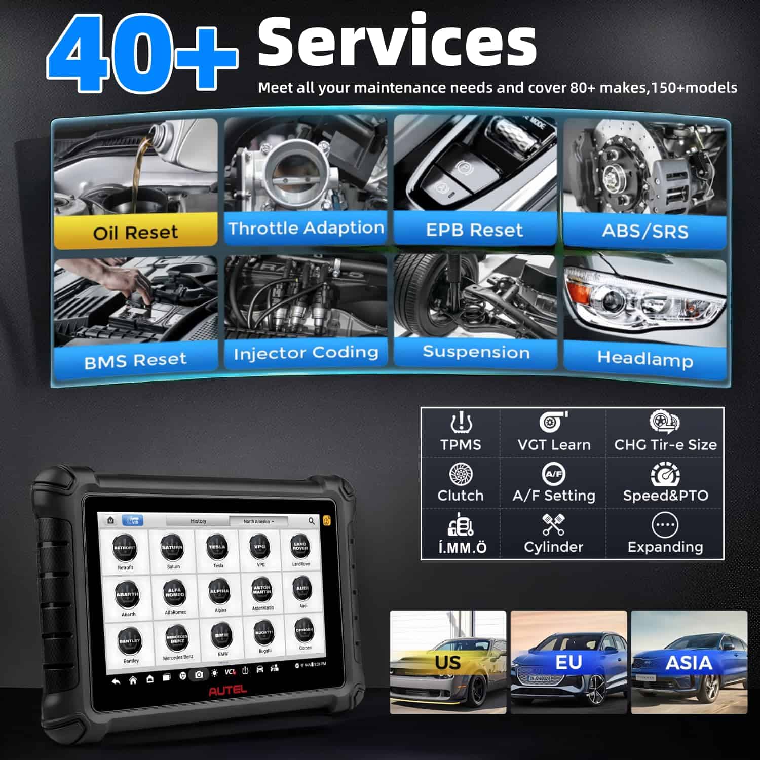 5. 40+ Servicios El escáner TPMS Autel TS900 ofrece una amplia gama de funciones de mantenimiento, similares al popular escáner de diagnóstico MK808TS. Incluye funciones esenciales requeridas por talleres de reparación, como Aceite, SAS, BMS, TPMS, Acelerador, Inyector, Cilindro, etc. Permite un ajuste fino con la mayoría de los vehículos y tiene una guía de procedimientos para guiarte a través de ellos. Ten en cuenta que no todas las funciones pueden estar disponibles para cada vehículo, así que contáctanos si tienes alguna preocupación de compatibilidad.