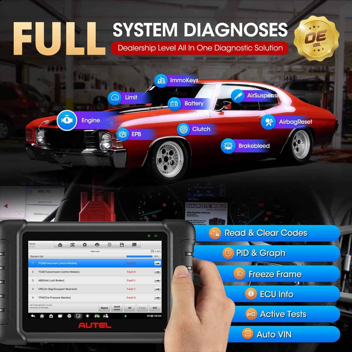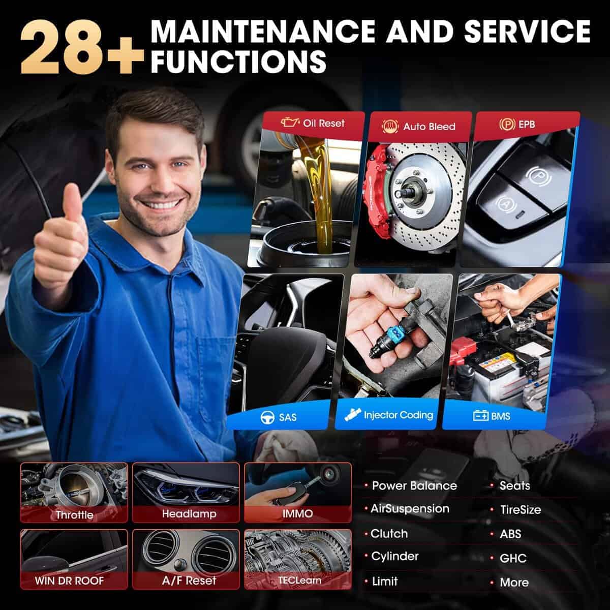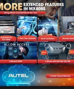 MaxiCheck MX808 es tu compañero perfecto. Instalado con un procesador de cuatro núcleos rápido, MX808 ofrece máxima conveniencia y diagnóstico rápido. La interfaz de usuario intuitiva hace que usar el dispositivo sea sencillo a través de una pantalla táctil LCD de 7 pulgadas que se muestra en calidad de 1024×600. Lee/borra códigos para todos los sistemas disponibles. Muestra datos en vivo en texto, gráfico y analógico para una fácil revisión de datos. La tecnología Auto VIN puede identificar automáticamente la marca, modelo e información del año del vehículo en poco tiempo. Reiniciar el Sensor del Ángulo de Dirección (SAS). Reiniciar el kilometraje de servicio y los intervalos de servicio. Volver a aprender la almohadilla del freno de estacionamiento después de su reemplazo. Admite regeneración forzada de DPF y ajuste de inyectores. Admite registro y reinicio de batería.