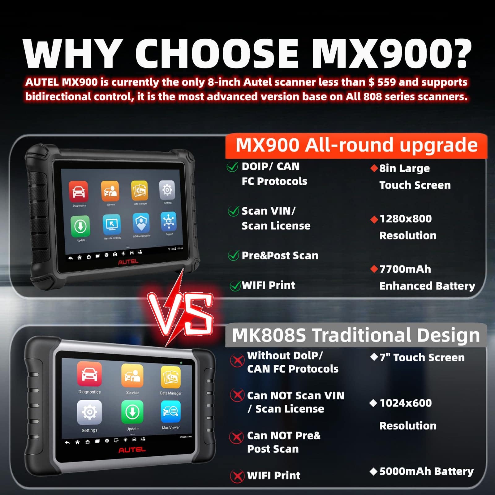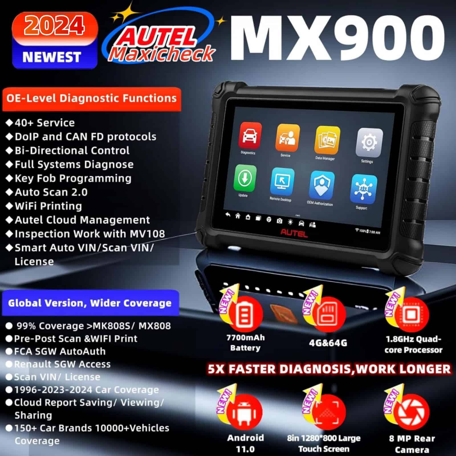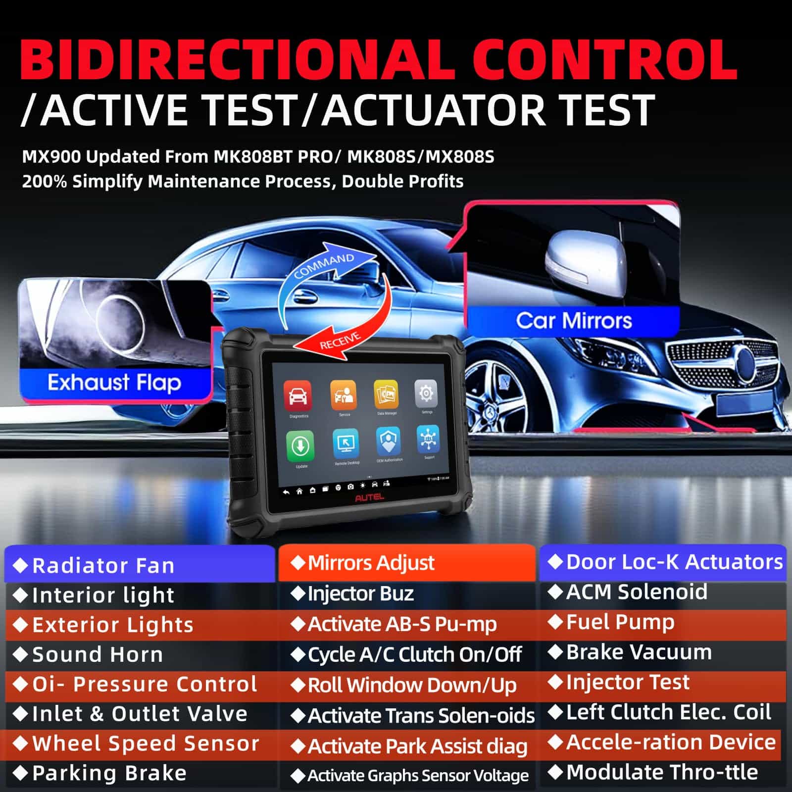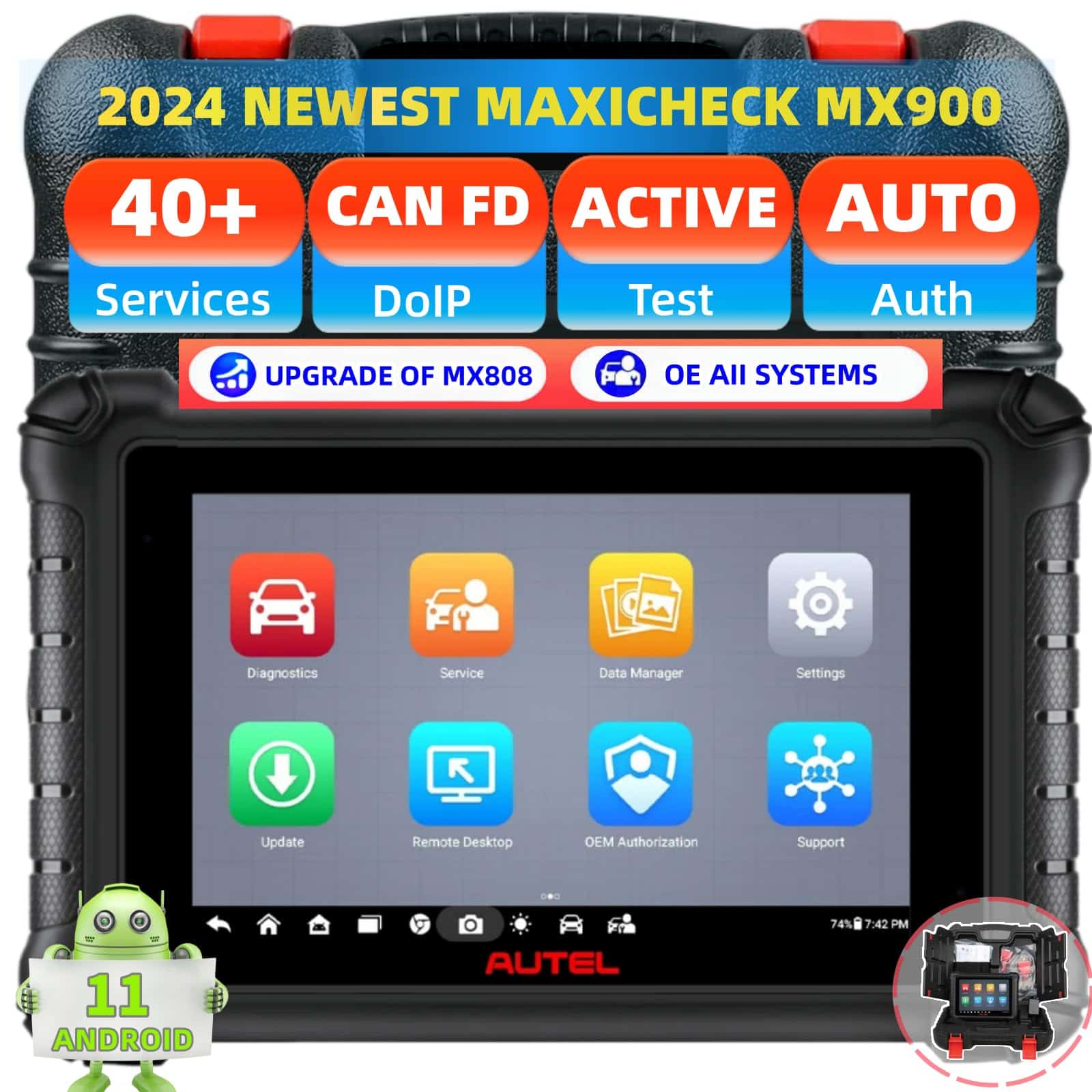 Autel MX900 es un escáner diagnóstico de vehículos completo que puede realizar pruebas funcionales y recuperar información de diagnóstico de vehículos como códigos de problemas y eventos y datos en vivo para varios sistemas de control de vehículos. Con más de 40 servicios y funciones, como Reinicio de Aceite, Reinicio de EPB, Reinicio de SAS, Registro de Batería, Reinicio de Acelerador, Sangrado ABS, Codificación de Inyectores, Programación de Llaves, etc. El escáner Autel MX900 es la elección ideal para dueños de talleres y mecánicos.