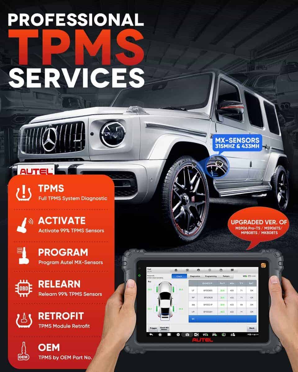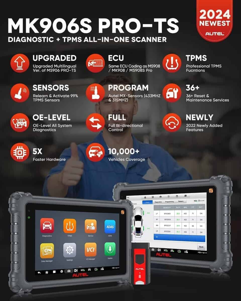3. Funciones completas de TPMS como Herramienta de OE TPMS ¡No necesitas una herramienta TPMS extra! En comparación con MK906 Pro/ MS906 Pro, el Nuevo MK906S Pro-TS integra perfectamente los completos Servicios de TPMS: activar/ reprogramar el 99 % de los sensores TPMS, programar sensores Autel MX (315/ 433MHz), apagar las luces TPMS, leer el número de pieza OEM del sensor, y proporcionar 3000+ procedimientos de reprogramación incorporados, etc. Además, MK906 Pro-TS soporta la Instalación de TPMS para asegurar una conducción segura si tu vehículo no viene instalado con el sistema TPMS por defecto.