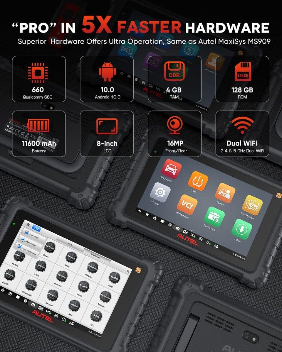1. 2024 hardware ultrapotente, ¡haz de MK906S Pro-TS el gallo sorpresa! ¡Autel ha actualizado por completo el MK906 Pro-TS al super rápido MK906S Pro-TS con 2024 hardware de primera, acelerando en un 200 %! en Android 10.0 (Dale un gran salto directamente al SO más rápido de Autel); Procesador Qualcomm 660 (5 veces más rápido que otros scanners); Batería super grande de 11600mAh para un día de trabajo; 4G RAM/ 128G ROM para una operación suave; Doble cámara de 16MP; Pantalla LED de 8.0″ con 1920 1200, etc. ¡Gánate más negocios!.