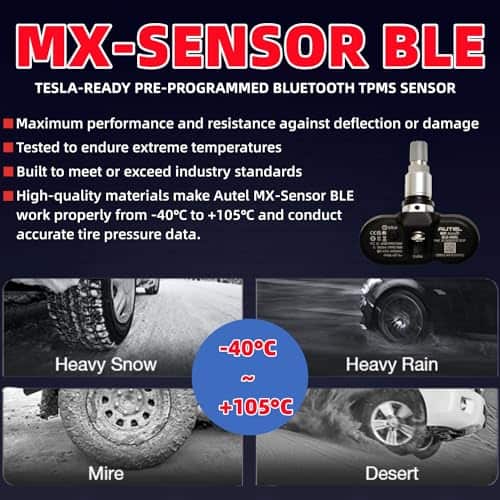 Autel MX-Sensor BLE es un sensor innovador diseñado para dispositivos BLE (Bluetooth de Baja Energía) que cumple o supera los estándares de la industria. Programable con las herramientas Autel para los últimos vehículos equipados con BLE. Compatible con tablets Autel MaxiTPMS ITS600/ITS600Pro/TS900 para programar estos sensores para vehículos nuevos a través de Bluetooth. Ofrece una solución conveniente y efectiva para el monitoreo de neumáticos, mejorando la seguridad y conectividad en la carretera. Fácil de usar con ajuste de válvulas disponibles en negro, cromo y gris para adaptarse a diferentes necesidades y estilos de vehículos. Ofrece funcionalidad de nivel OE con capacidad de ‘plug and play’ para una instalación rápida y sin problemas en modelos Tesla 3, Y, S, y X equipados con sensores BLE TPMS. Adopta el último protocolo Bluetooth de Baja Energía para mantener altas velocidades de transmisión de datos con menor consumo de energía y una vida útil de batería de más de 6 años.
