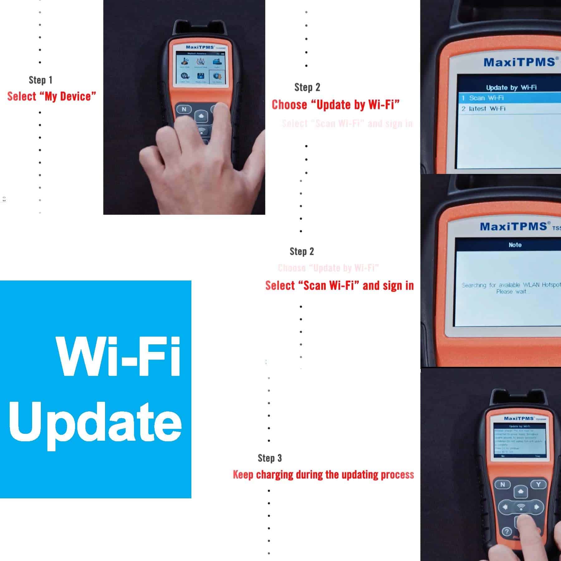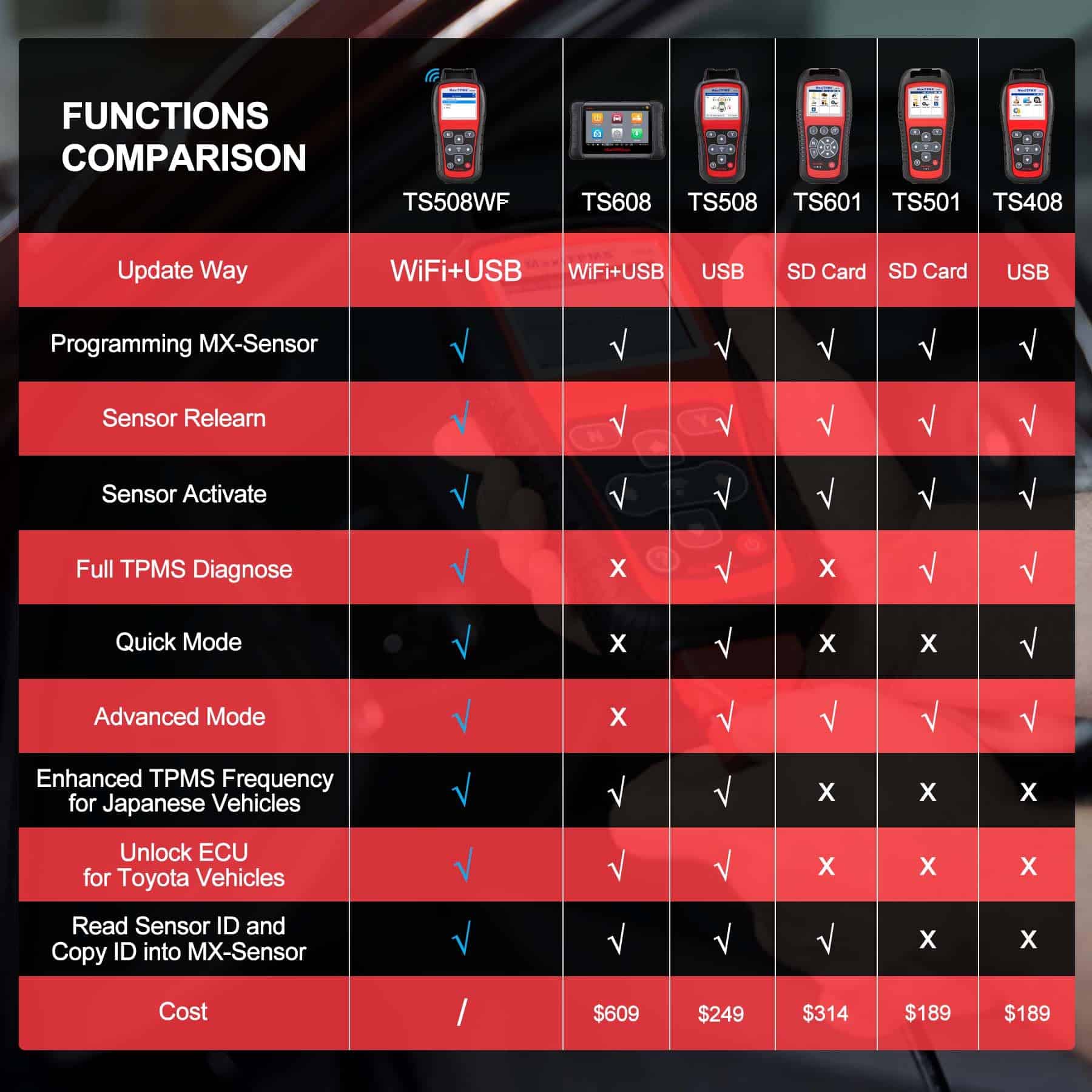 2. Diagnósticos TPMS completos TS508WF La herramienta de TPMS TS508WF puede leer/borrar fallos del sistema TPMS, activar sensores TPMS y realizar procedimientos de programación de la identificación de los sensores TPMS y reprogramación. También ofrece funciones avanzadas como análisis de la forma de onda del sensor TPMS y programación de la unidad de control del TPMS. La herramienta también ofrece funciones básicas de OBDII como lectura/borrado de códigos DTC y visualización de datos en tiempo real. NOTA: La herramienta TPMS TS508WF no verifica la compatibilidad antes de la compra.