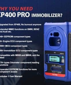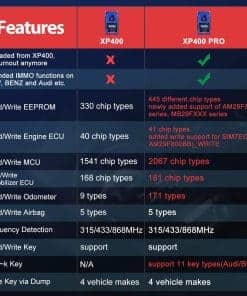 Como la herramienta de programación de llaves más reciente de 2024, el Autel XP400 PRO se presenta como la versión avanzada del XP400. Agregando más funcionalidades para BMW, BENZ, así como funciones más potentes en la lectura/escritura de EEPROM, MCU, ECU, el XP400 Pro garantiza satisfacer la mayoría de sus necesidades de programación de llaves. Con la capacidad de leer y escribir datos de más de 3,000 Tipo de Chips, este programador de llaves y chips todo en uno es compatible con Autel IM508/IM508S/ IM508S PRO/IM608/ IM608 PRO II/ IM608S II para expandir sus funciones IMMO. Desde añadir una nueva llave hasta realizar Restablecimiento/Adaptación de ECU IMMO, Refresco/Codificación de ECU IMMO, Aprendizaje Remoto, Aprendizaje de Claves para AUDI Q5/A4/A5 2015-2017, VW MQB, BMW FEM/BDC/CAS4, entre otros, el XP400 Pro es una herramienta esencial para cualquier especialista en programación de llaves. Con una compatibilidad garantizada con IM508, IM508S, IM608S II, IM608 PRO II, IM608, IM608 PRO, el XP400 Pro cuenta con una cobertura incomparable de chips de llaves y ECU. Capaz de leer/escribir 445 chips de llaves diferentes, incluyendo soporte recientemente añadido para la serie AM29FXXX, serie MB29FXXX, leer y escribir EEPROM, ECU de Motor, ECU de Inmovilizador, Encryption Chip MC9S12, IC Card, Llave Infrarroja de Mercedes, detección de frecuencia remota, entre otras funciones avanzadas. Respaldado por un reemplazo nuevo o reembolso completo dentro de los 30 Días, y protegido de defectos por 12 Meses por el vendedor de EE.UU., el Autel XP400 Pro es una compra segura. Sin embargo, cabe mencionar que no todas las funciones son compatibles de forma universal.