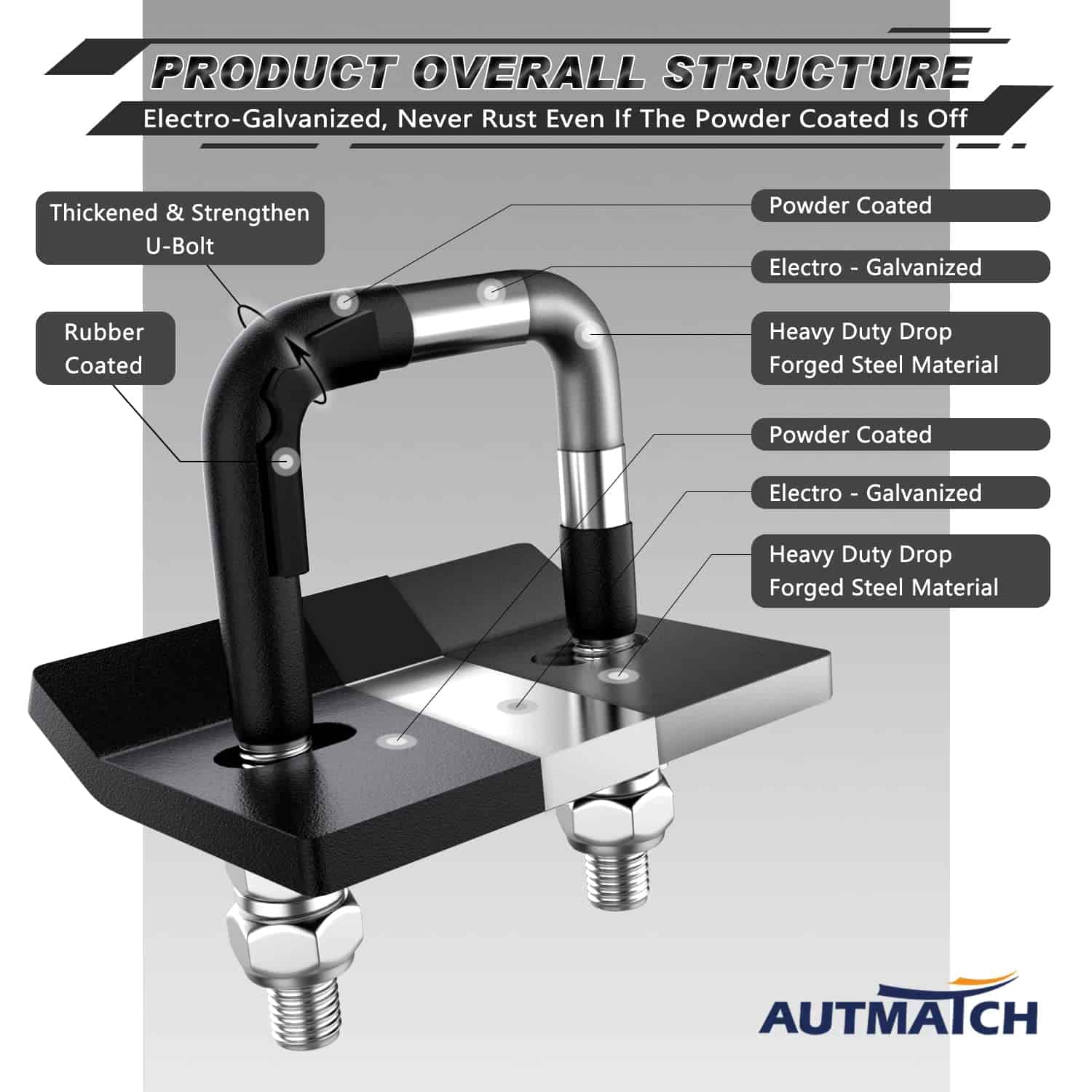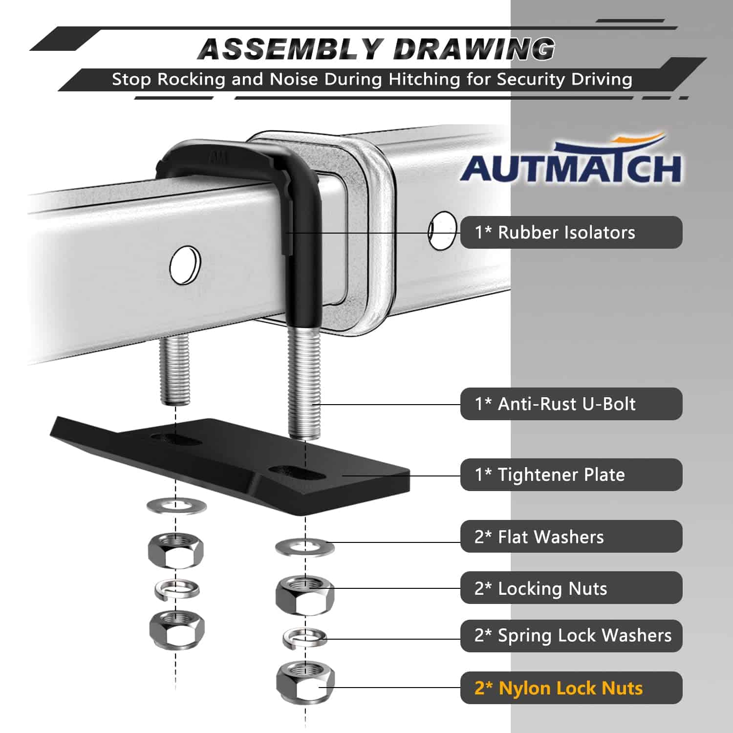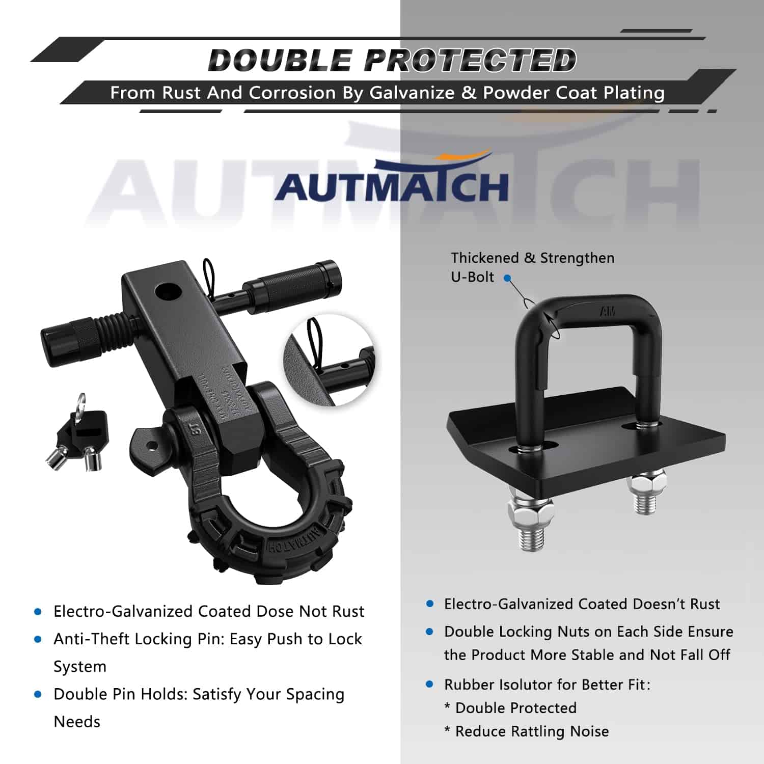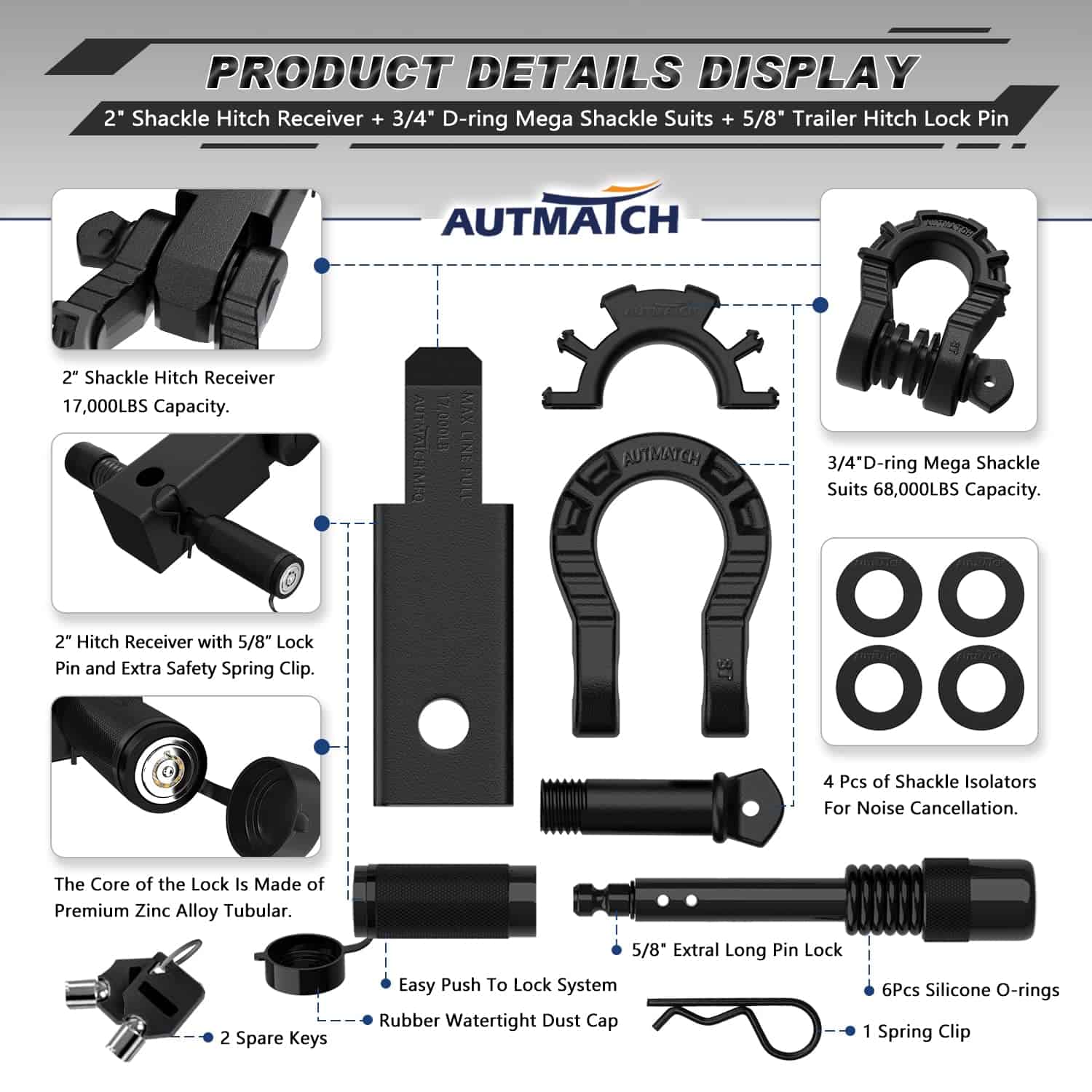 El Conjunto de Enganche Mega Gancho de AUTMATCH Proporciona una Potencia de Remolque Superior y un Mejor Agarre para Cumplir con las Necesidades de Recuperación de su Vehículo y Acompañar sus Viajes. El Apretador de Enganche de AUTMATCH está Construido con Acero Forjado Resistente para Evitar el Balanceo, la Oscilación, el Ruido y el Movimiento del Enganche en Portabicicletas con Enganche, Portaequipajes de Carga y Otros Accesorios de Remolque con Enganche. Son una Combinación Perfecta. Nuestra Visión Era Crear una Marca de Exploración Valiente que se Alinee con Nuestras Creencias Fundamentales, Una Marca con la que Te Identificarás y te Unirás con Entusiasmo, Cambiando el Mundo que nos Rodea Ayudando a Apoyar una Gran Causa.