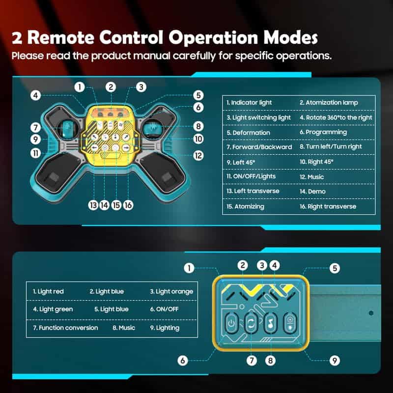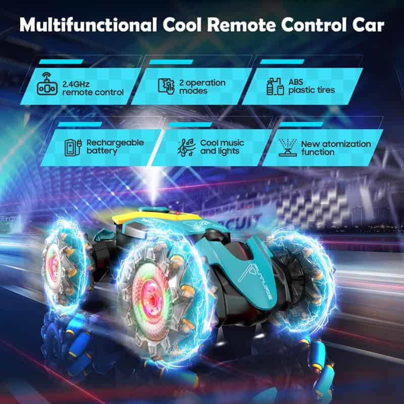 Giro de 360 grados, frecuencia de control sin interferencias de 2.4GHz, control a larga distancia, atomización incorporada, música y luces.