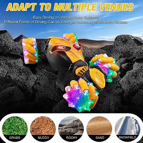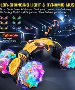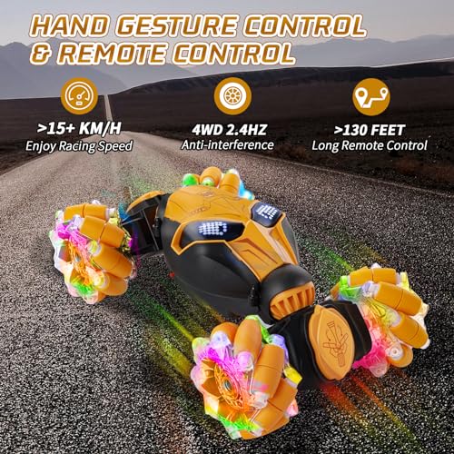 AGEVE Coches de Control Remoto por Gestos Coche de Acrobacias por Control Remoto para Niños de 6 7 8 9 10 11 12+ Años, 2.4GHz 4WD RC Doble Cara 360 Volteos Vehículo Todo Terreno Juguetes con Luces/Música Regalos para Niños Niñas Amarillo y Azul