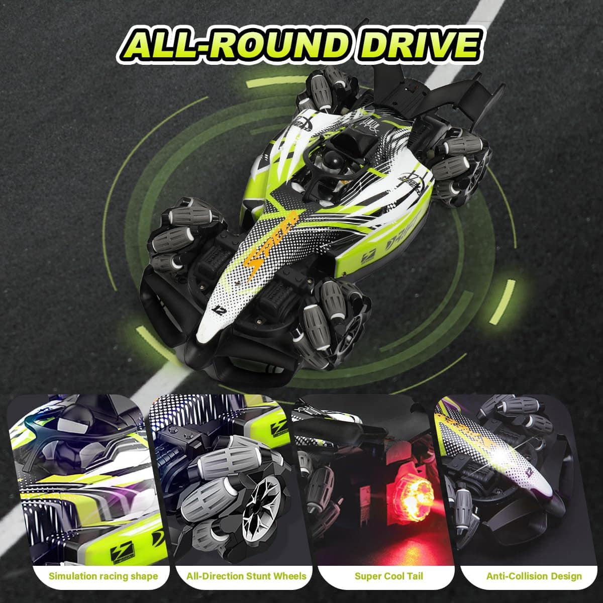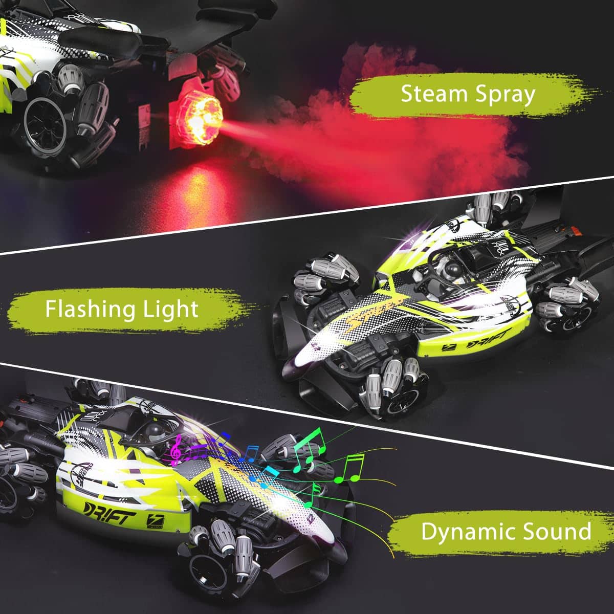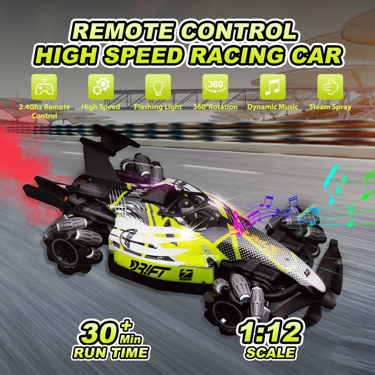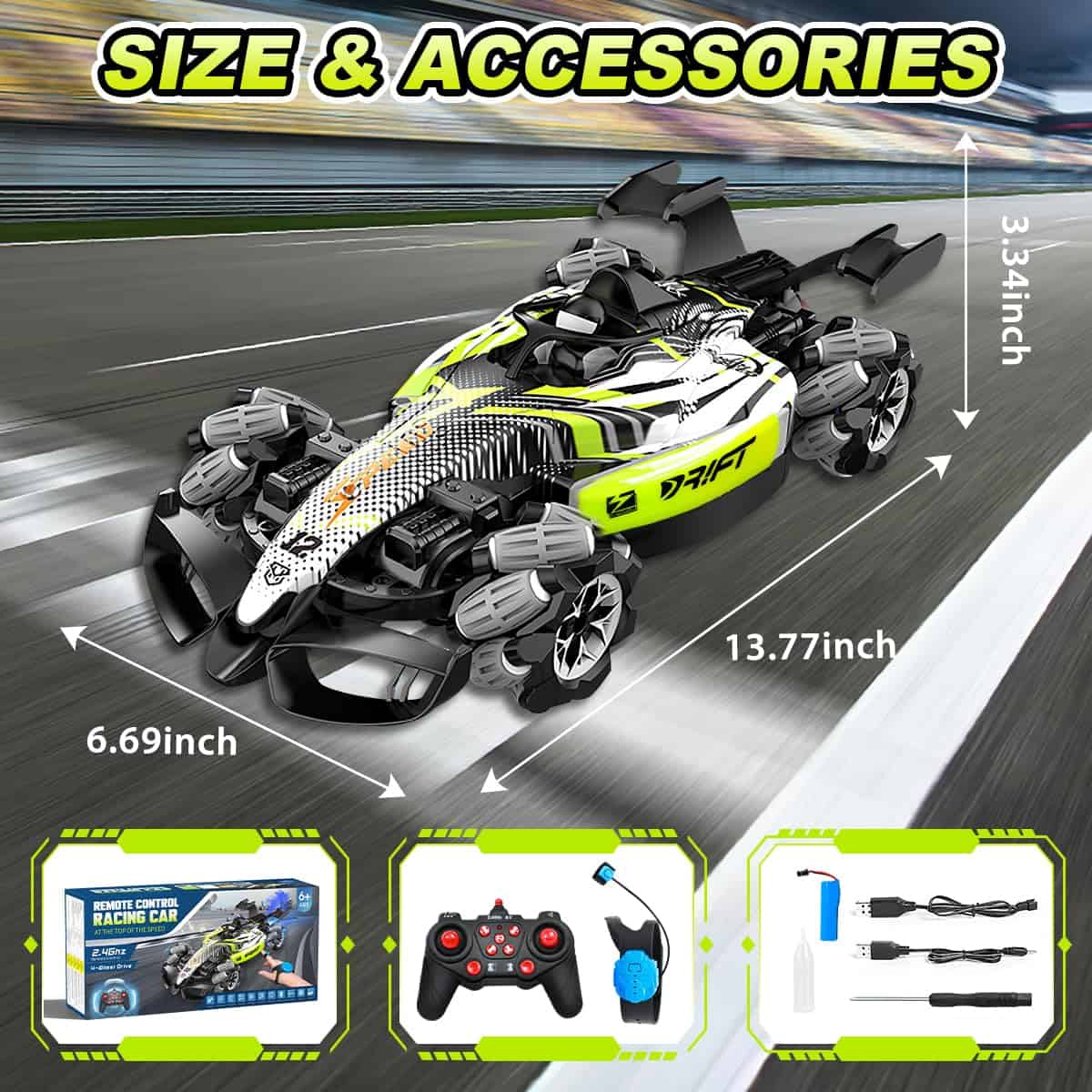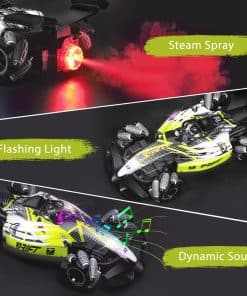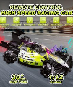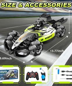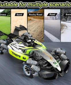 Nuestro coche de carreras rc F1 con dos formas de control: controlador de gestos y control remoto, lo que permite disfrutar de más diversión al conducir con gestos. El control remoto de 2.4 GHz garantiza que los niños puedan correr y jugar libremente sin interferencias. Equipado con potentes motores, el coche acrobático off road puede alcanzar una velocidad máxima de 25 km/h, puede derrapar en todas direcciones, caminar lateralmente, rotar en 360 grados. El juguete de tamaño grande a escala 1:12 permite a los niños y a ti tener experiencias emocionantes. Hecho de plástico ABS duradero y metal de alta calidad, equipado con neumáticos únicos a prueba de choques; mayor resistencia al impacto, a prueba de golpes y irrompible. Este duradero coche RC todo terreno es adecuado para diferentes áreas como praderas, suelos arenosos, caminos de montaña agrestes, etc. Puede superar fácilmente diversos obstáculos. El coche rc de control por gestos tiene efectos de iluminación impactantes, música y un dispositivo de spray frío. Hay una pequeña caja de almacenamiento de agua diseñada en la cola del coche, en la cual puedes añadir agua con el gotero incluido. Después de encender el coche, presiona el botón para el rocío en el control remoto, se liberará una fina niebla junto con luces rojas, trayendo al coche una traza de movimiento fresca y encantadora, escapando como un verdadero coche de carreras. El regalo de coche teledirigido controlado a mano está especialmente diseñado para niños de 6 a 12 años, con un diseño maravilloso y características geniales. Los niños pueden disfrutar de una gran experiencia de juego de carreras en el suelo, patio trasero, calle, etc. Es el regalo perfecto para el cumpleaños de tu hijo, Navidad y Año Nuevo.