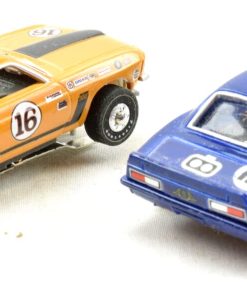 INCLUDES: 1 Juego Completo de Carreras Escala HO con 2 Autos, Pista, Controladores y Fuente de Alimentación. CARS: Thunderjet Ultra G 1968 Camaro & 1970 Mustang. TRACK: 14′ De Pista de Carreras. ACCESSORIES: Barandas de Seguridad, Puente para Espectadores, Tribuna, Puerta de Inicio / Finalización, Paño de Limpieza de Pista y Calcomanías. FULLY COMPATIBLE TRACK: Funciona con toda la Pista Auto World & AFX.