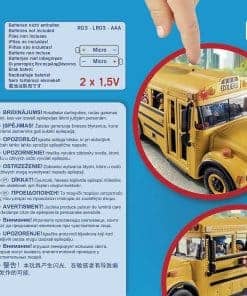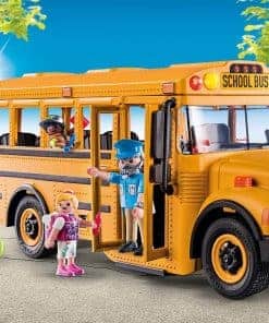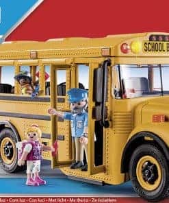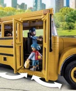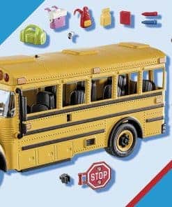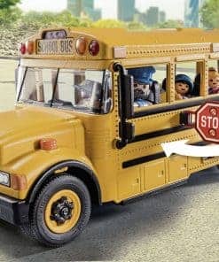 ¡Hora de ir a la escuela! Dirígete a un día de aprendizaje en el Autobús Escolar. Las luces delanteras y traseras funcionan intermitentemente mientras el conductor del autobús se acerca a la parada de autobús y extiende la señal de parada. Una vez que se abren las puertas dobles, los niños pueden subir a bordo y elegir un asiento. Accede fácilmente al interior espacioso, con asientos para hasta siete figuras, gracias al techo desmontable. El set incluye conductor de autobús, tres estudiantes, mochilas, lonchera, lápices y otros accesorios. Recomendado para edades de cuatro a diez años. Advertencia. Peligro de asfixia. Piezas pequeñas. No apto para niños menores de 3 años.