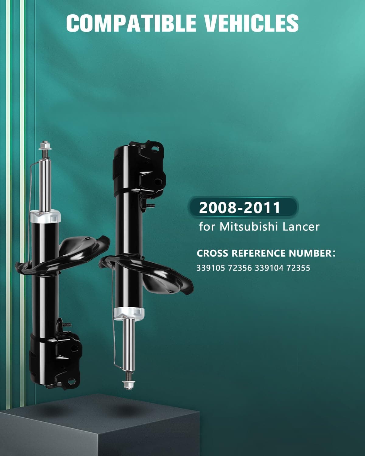 AUTOMUTO Amortiguadores, 2 piezas Kit de amortiguadores delanteros aptos para 2008 2009 2010 2011 para Mitsubishi Lancer 339105 72356 339104 72355. Este amortiguador de alto rendimiento está diseñado para ofrecer una conducción más suave y cómoda. El vástago de pistón de alta resistencia garantiza la durabilidad y resistencia al desgaste del amortiguador. El sello de aceite de calidad superior y el proceso de fabricación avanzado aseguran la estabilidad y durabilidad del amortiguador. Con una instalación directa sin necesidad de modificaciones, este kit de amortiguadores es una opción confiable y duradera. Experimente una mejor absorción de impactos y una mejora en la comodidad de conducción con este juego completo de conveniencias que incluye un par de amortiguadores delanteros nuevos y probados para cumplir o superar las especificaciones OEM.