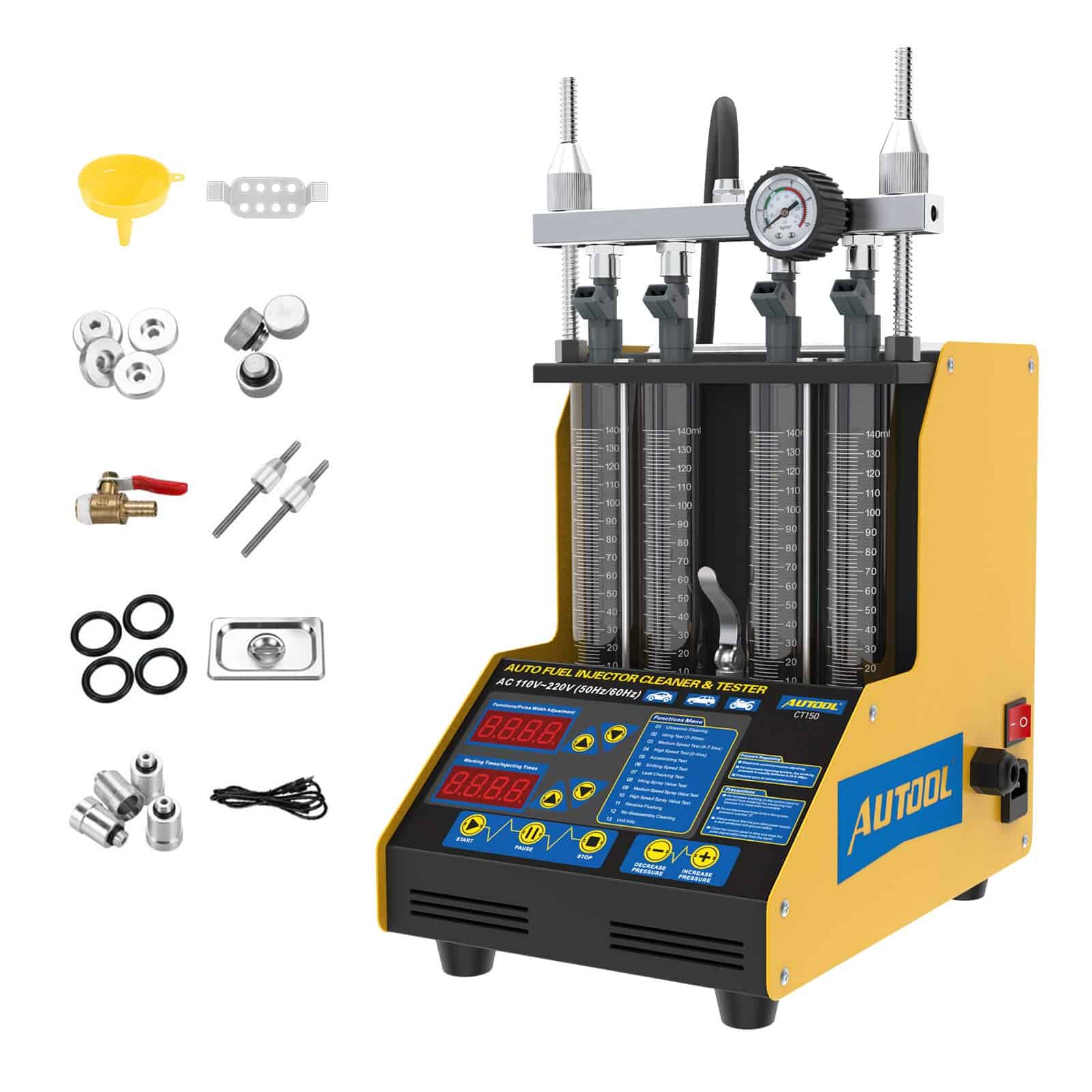 Función principal: A. Limpieza de inyectores de gasolina con ultrasonido B. Limpieza de bujías Colocar la bujía en el tanque de limpieza, introducir el líquido de limpieza y comenzar a limpiar C. Prueba de inyección del inyector en diferentes situaciones, verificar fugas y obstrucciones D. Limpieza de inyectores sin desmontaje (necesita accesorio adicional y tarifa adicional, elija usted mismo) E. Limpieza de la válvula del acelerador sin desmontaje. (necesita accesorio adicional y tarifa adicional, elija usted mismo) F. Configuración estándar solo para inyectores de alimentación superior (el adaptador de inyección lateral necesita tarifa adicional, elija usted mismo) G. Limpieza y prueba de inyectores de motocicletas, función de prueba solo para inyectores HONDA YAMAHA SUZUKI SANYANG, (necesita accesorio adicional y tarifa adicional, elija usted mismo) Cómo funciona la máquina de limpieza CT150: 1. Limpiar el exterior del inyector con gasolina o líquido de limpieza antes de abrir la máquina. 2. Colocar los inyectores en la bañera de ultrasonido después de que el exterior del inyector esté libre de suciedad. 3. Encender el sistema ultrasónico pulsante que permitirá que la energía ultrasónica desaloje cualquier partícula o acumulación incluso dentro de los inyectores. 4. Fijar los inyectores en la máquina principal. 5. Prueba de los inyectores para resistencia, cortocircuitos y consumo de corriente. 6. Realizar una prueba de fuga, patrón de pulverización y caudal en banco de pruebas de flujo. 7. Los inyectores ahora se devuelven al banco de pruebas de flujo para volver a probar todas las funciones. Condición de trabajo: Fuente de alimentación: AC220V/AC110V 10% Frecuencia: 50 HZ 0.5 Humedad: 85% Temperatura ambiente: 0-40 Especificaciones: Capacidad del tanque de combustible: 2000 ml Capacidad del cilindro de medición: 125 ml Rango de velocidad: 0-7500 rpm Tiempos de inyección: 0-9900 Paso: 100 ms Pulso PWM: 0-20.0 ms Paso: 0.1 ms Presión del sistema: 0-0.6Mpa (ajustable) Tiempo: 0-20 minutos (ajustable) Potencia de limpieza ultrasónica: 70 W Frecuencia de limpieza ultrasónica: 28 KHZ 0.5 KHZ Paquete incluye: 1 juego x unidad CT150