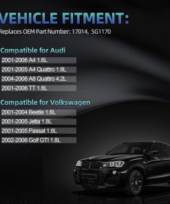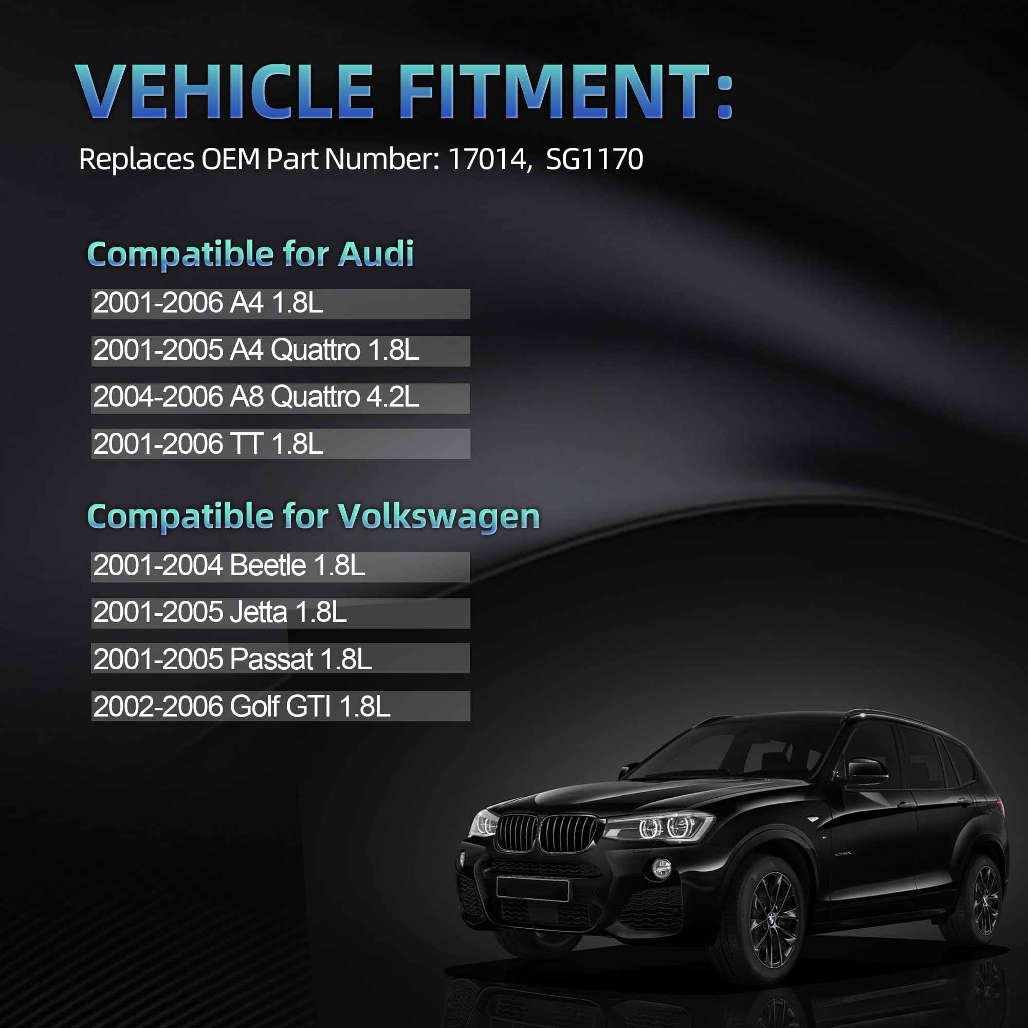 1. Ajuste de Vehículos: Compatible para Audi A4 1.8L 2001-2006; Compatible para Audi A4 Quattro 1.8L 2001-2005; Compatible para Audi A8 Quattro 4.2L 2004-2006; Compatible para Audi TT 1.8L 2001-2006; Compatible para Volkswagen Beetle 1.8L 2001-2004; Compatible para Volkswagen Jetta 1.8L 2001-2005; Compatible para Volkswagen Passat 1.8L 2001-2005; Compatible para Volkswagen Golf GTI 1.8L 2002-2006.