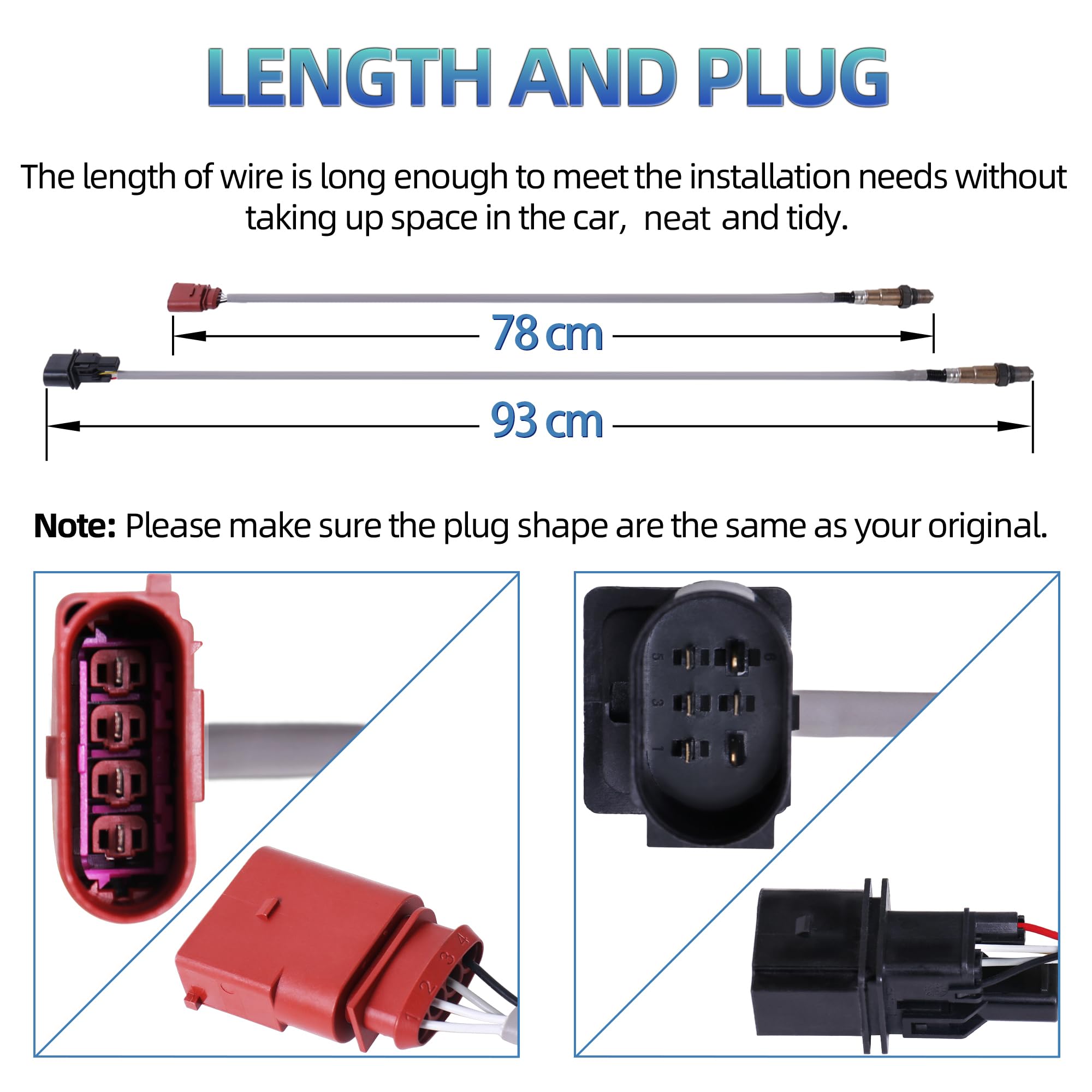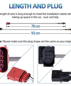 4. Especificación Estándar: Paquete Incluido: 1 x Sensor de Oxígeno Arriba + 1 x Sensor de Oxígeno Abajo. Tipo: Calefacción de 5 y 4 hilos. Longitud Total: 93 y 78cm. Longitud del arnés: 78 y 64cm. Género del Conector: Hembra. Cada sensor de oxígeno está pre-recubierto con agente anti-sinterización para evitar la sinterización de los hilos durante el funcionamiento y prolongar la vida útil del servicio.