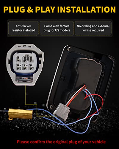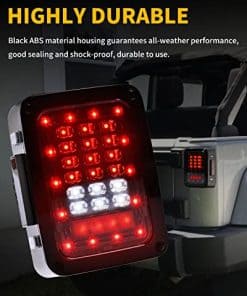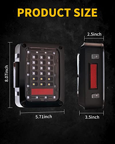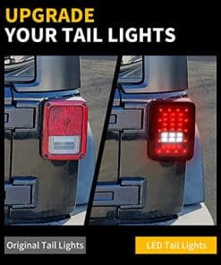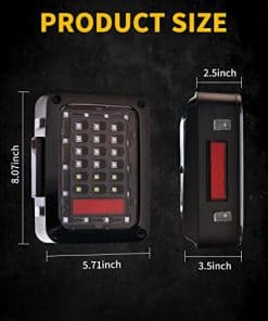 Especificaciones Voltaje de trabajo: DC12V, Resistente al agua: IP67, Material: carcasa duradera de ABS negro y lente clara. Color de luz: Luz de freno/señal de giro (rojo), Luz de marcha (rojo), Luz de reversa (blanco). El paquete incluye: Un par de luces traseras LED (lado del conductor y lado del pasajero). Aplicación: Compatible con Jeepp Wrangler JK & Wrangler Unlimited 2007-2018. Aviso amable Esta luz trasera LED tiene un conector hembra para modelos de EE. UU. Confirme si su vehículo requiere un conector macho o hembra antes de realizar la compra. Características de la luz trasera LED AUXLIGHT Fácil instalación — plug and play, necesita 15 minutos o menos Súper brillante — LED de alto rendimiento, mucho más brillante que las lámparas halógenas Material duradero — carcasa de ABS negro, duradera de usar Libre de errores — resistencia incorporada para evitar el parpadeo hiperrápido o el código de error en el tablero Bien sellado — carcasa sellada, protege las bombillas de la luz del agua, el polvo y el mal tiempo Sin retraso — Tiempo de respuesta rápido al encenderse y apagarse para una conducción segura