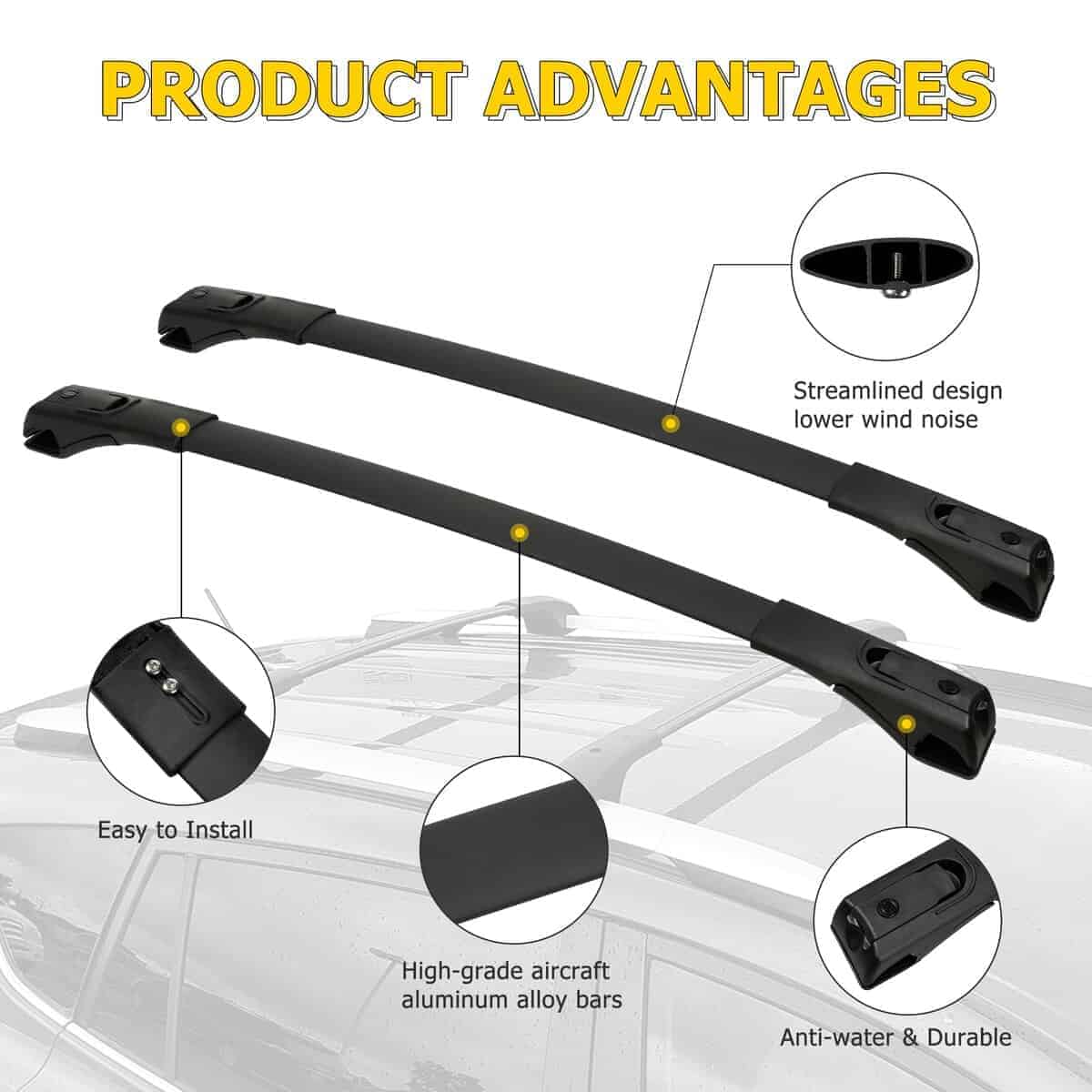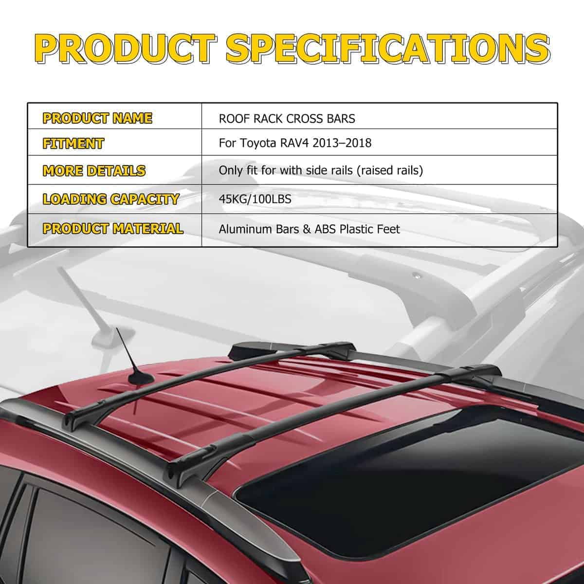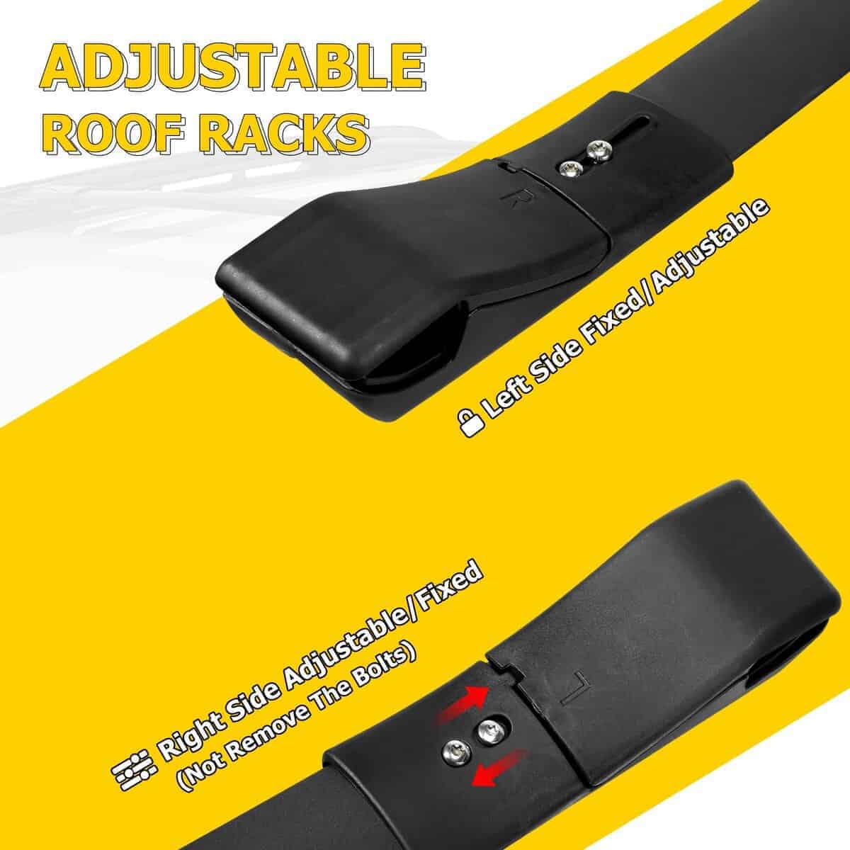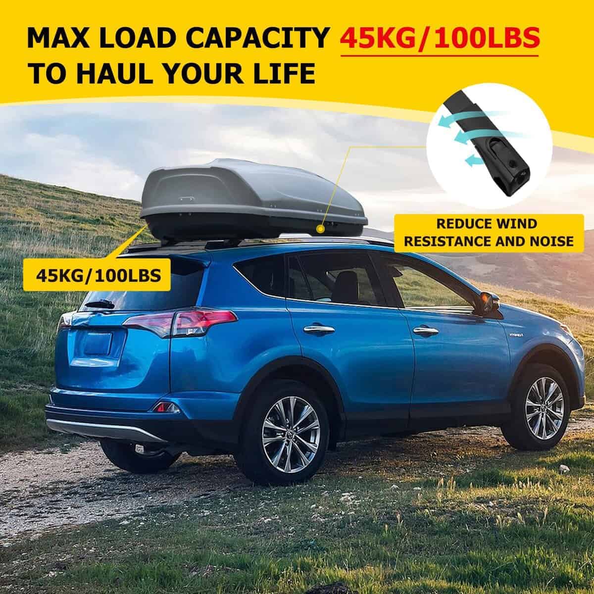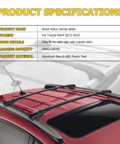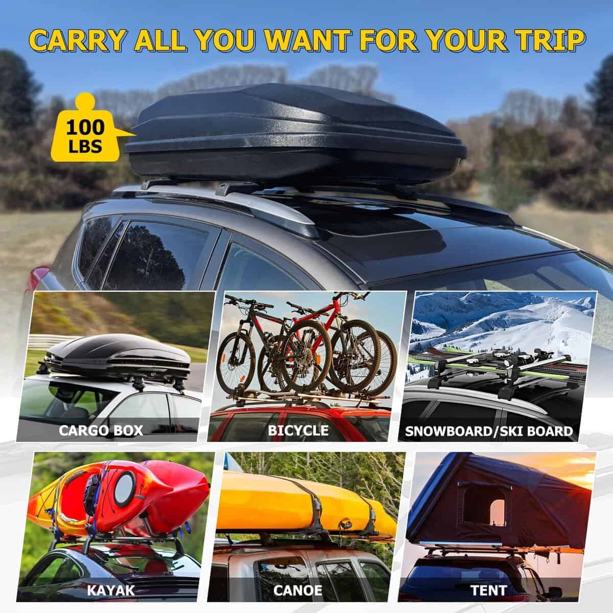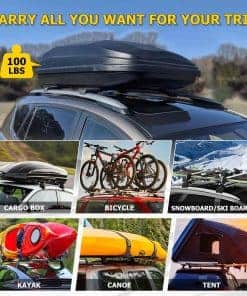 3. Capacidad de Carga: 100LBS/45KG cuando la carga se distribuye de manera uniforme. Puede funcionar con accesorios de techo como cesta para equipajes, porta bicicletas/snowboard, caja de equipaje, soporte para kayak, etc.