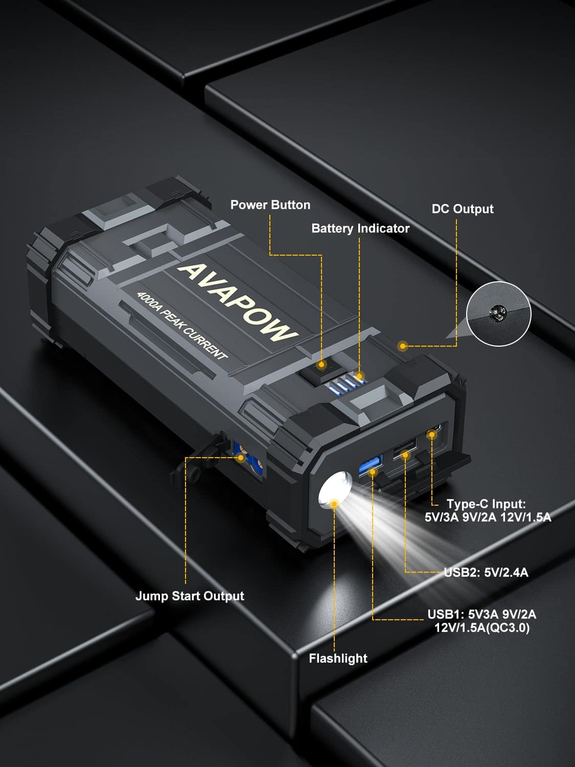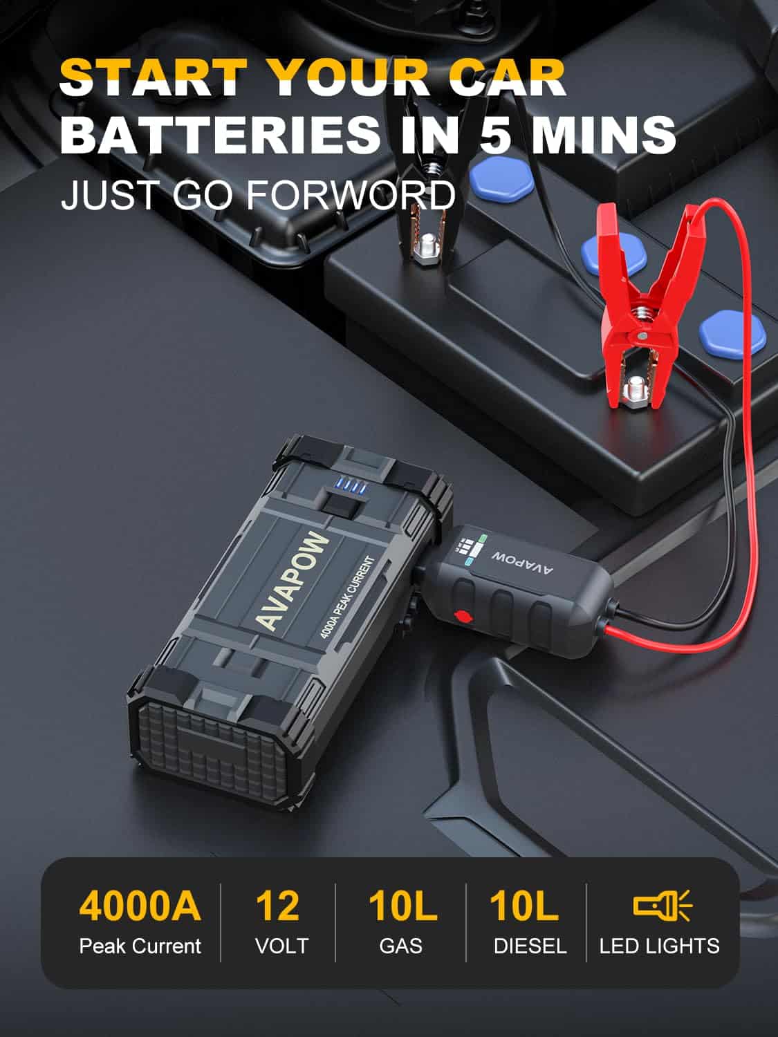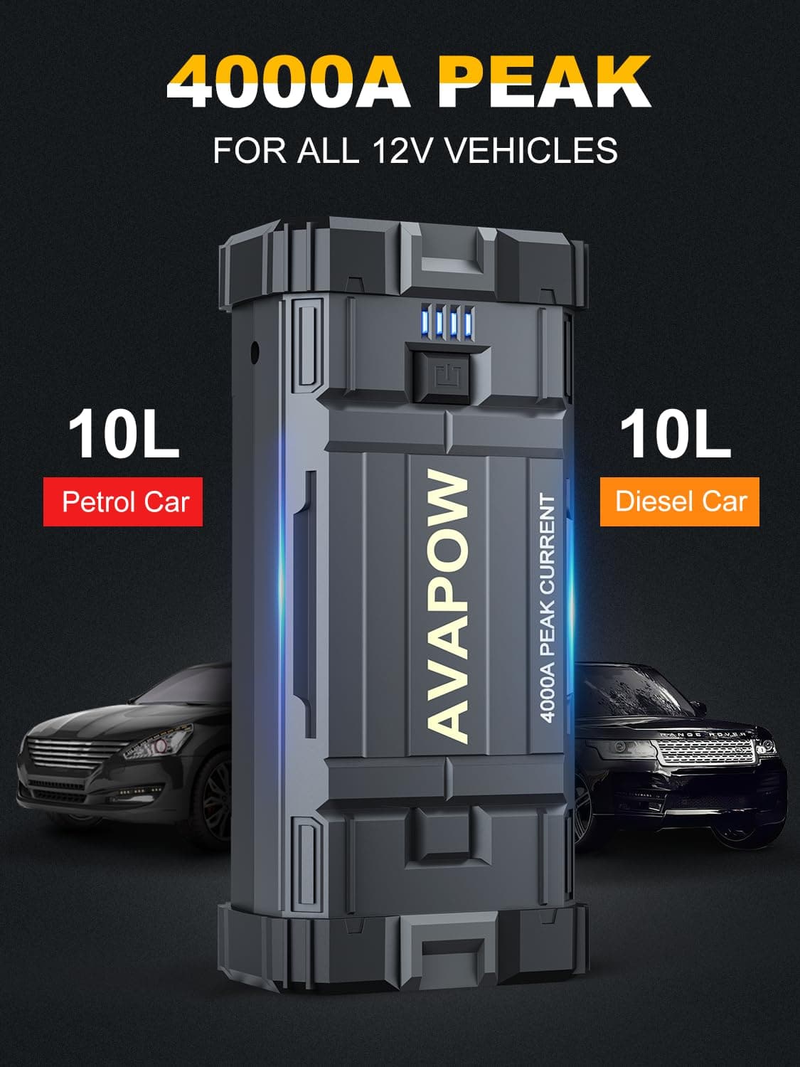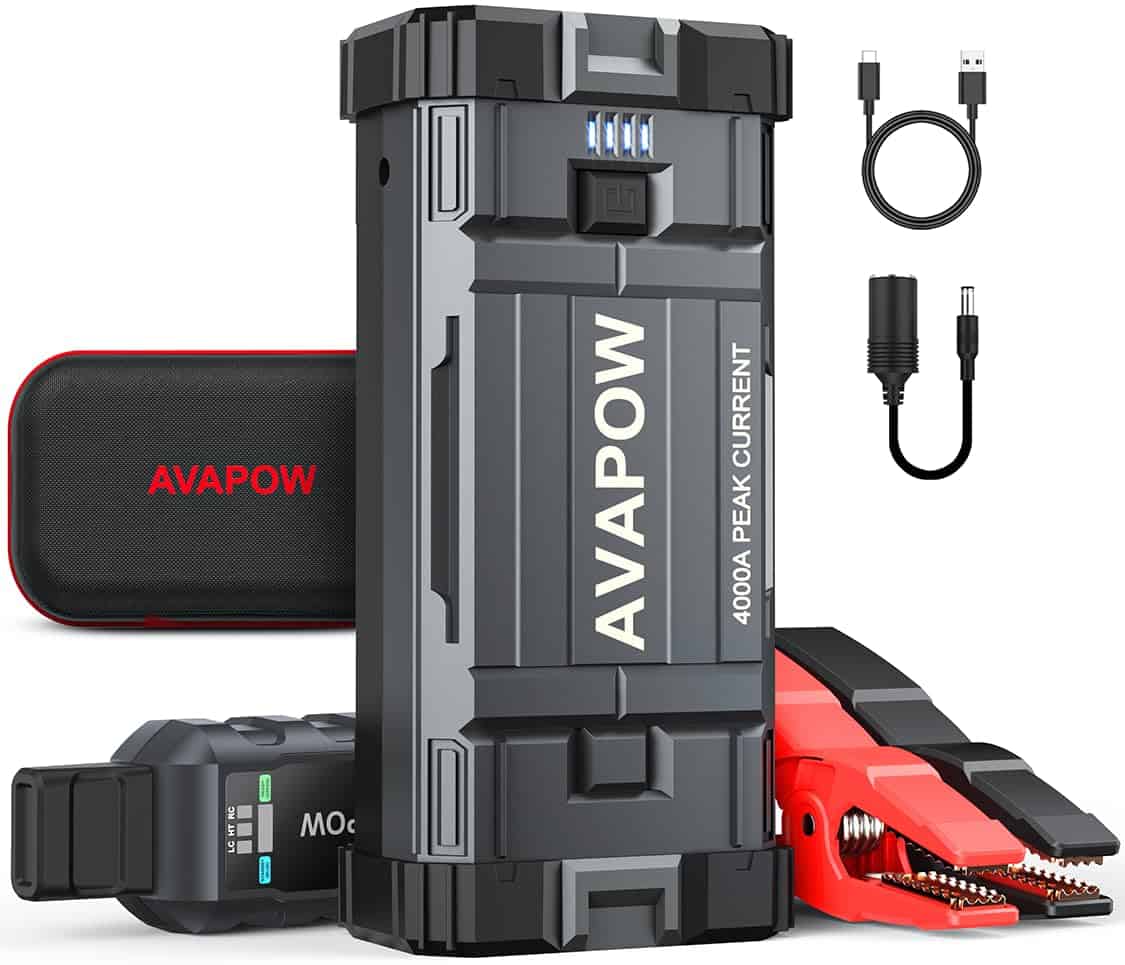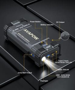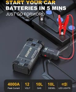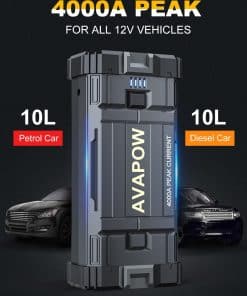 1. POTENTE Y DE GRAN CAPACIDAD – El arrancador de coche AVAPOW proporciona hasta 4000A de corriente de pico, lo que puede arrancar todos los coches de 12V (incluidos los de potencia híbrida), como motocicletas, ATVs, UTVs, cortacéspedes, motos de nieve y más fácilmente en solo unos minutos (para todos los gasolina o hasta 10L diesel) – hasta 60 veces con una carga completa.