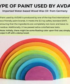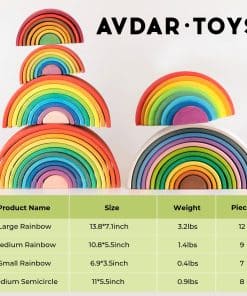 AVDAR 8Pzas Juguete Apilador de Arco Iris de Madera en Forma de Semicírculo es una opción de calidad, fabricada con madera de tilo de alta calidad que ha sido importada y pulida a mano para eliminar cualquier aspereza. Con una apariencia cálida y cómoda, este juguete promueve la imaginación, habilidades de resolución de problemas y confianza en los niños a través del juego abierto. Con una selección estricta de recubrimiento de pintura, garantiza la seguridad de los materiales. Cumple con certificaciones internacionales de seguridad de juguetes, como EN71 de la Unión Europea, GB6675 de China, ASTM y CPSIA de los Estados Unidos, garantizando que no contiene componentes dañinos como formaldehído, químicos nocivos, metales pesados, entre otros. Con un tamaño total de 11 pulgadas x 5.5 pulgadas, los juguetes Montessori consisten en diferentes colores y tamaños para mantener a los niños entretenidos durante horas, perfecto para diversas ocasiones.