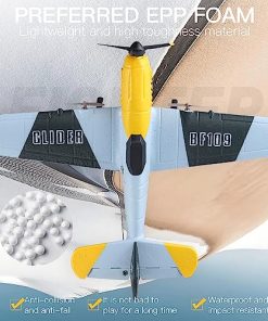 Aviso: 1. El avión RC no es un juguete y no es adecuado para niños menores de 14 años, mantener alejado de los niños. 2. Leer las instrucciones antes de usar, si eres un principiante, es recomendable que te asista un adulto experimentado. Características: 1. Tamaño a escala, avión clásico BF-109 RC. 2. Espuma EPP. 3. El Avión RC tiene un sistema de vuelo de estabilización de seis ejes con giroscopio integrado, lo que permite que los principiantes lo controlen fácilmente. 4. El control remoto viene con control de timón pequeño y grande. El timón pequeño es para principiantes y el timón grande permite acciones acrobáticas, como rotaciones… 5. El cargador USB permite cargar 2 baterías al mismo tiempo. 6. Aviones RC montados y listos para volar directamente de la caja y vienen con un sistema de control remoto de 2.4Ghz de 3CH. Descripción: Modelo: Aviones RC de 3 canales con control remoto de 6 ejes Cuerpo: EPP Espuma de estireno Envergadura: 415mm Fuselaje: 395mm Especificaciones: Tiempo de vuelo: 7-8min Tiempo de carga: aproximadamente 30min Control remoto: 2.4G 3CH Distancia del control remoto: 250 pies Motor: Motor sin núcleo 0716 2 Batería: Recargable de 3.7V Lipo Cargador: Cargador USB 1S Función: Vuela hacia arriba y hacia abajo, gira a la izquierda y a la derecha, giro de 360 grados Paquete incluido: 1 x Avión RC 1 x Control remoto de 2.4G 3CH 1 x Cargador 2 x Hélices CW 2 x Hélices CCW 2 x Batería 2 x Tren de aterrizaje