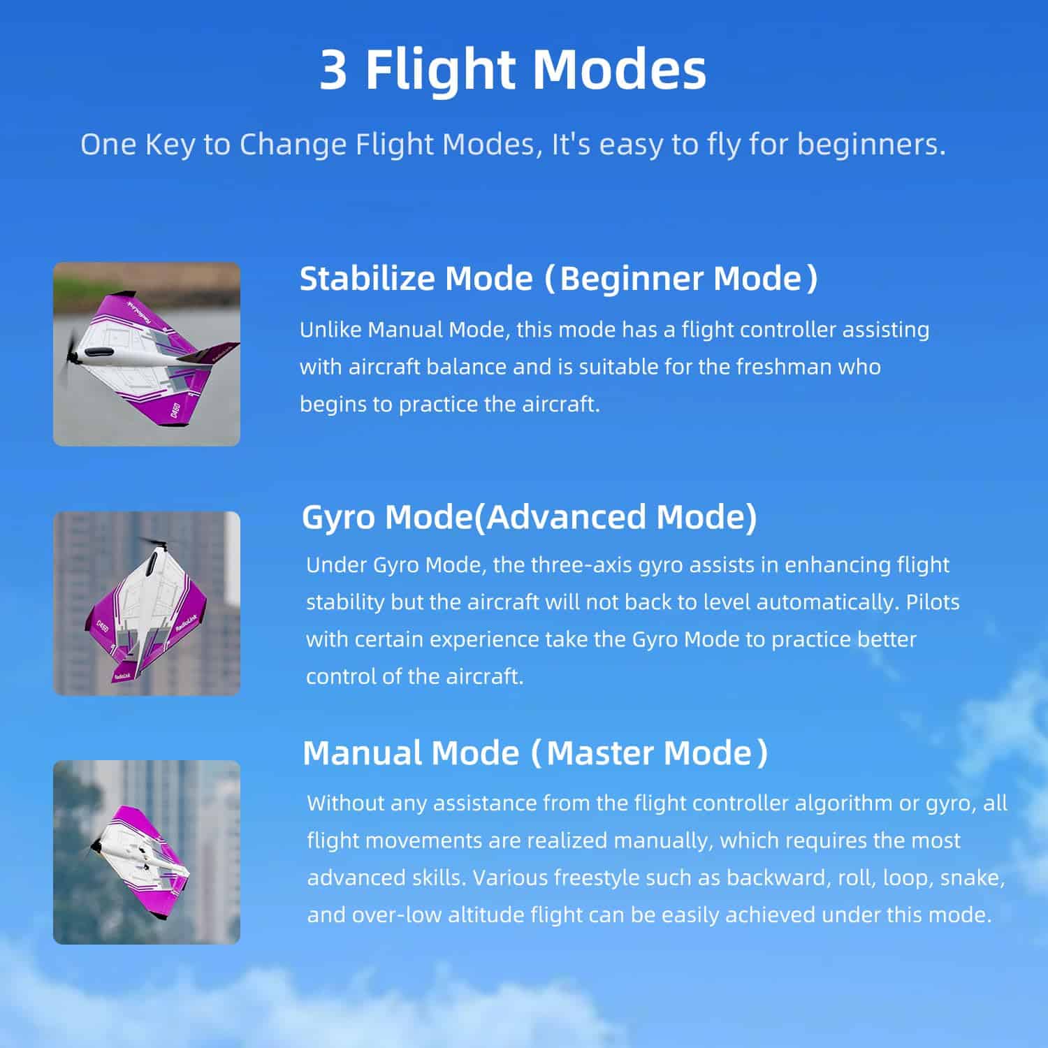 2. 3 Modos de Vuelo, Listo para Volar – El avión RC Radiolink D460 tiene Modo Estabilizado, Modo Gyro y Modo Manual. Soporta un botón para cambiar modos de vuelo. Es amigable e interesante cuando lo vuelas en el patio. No necesita ser ensamblado o ajustar parámetros cuando lo saques de la caja, lo que te llevará a un vuelo rápido.